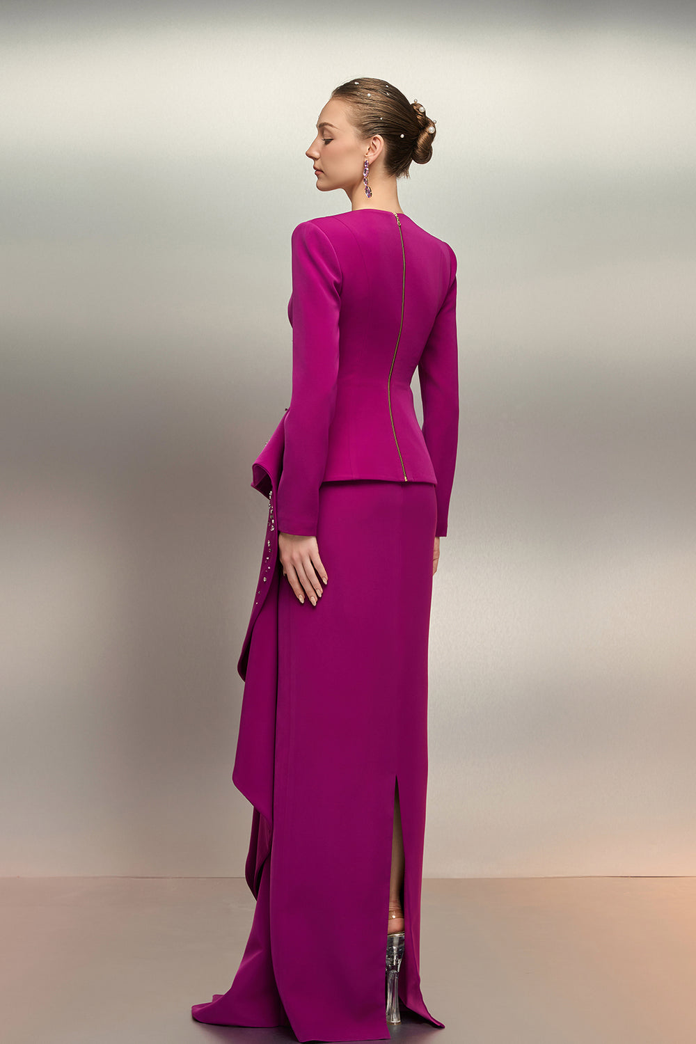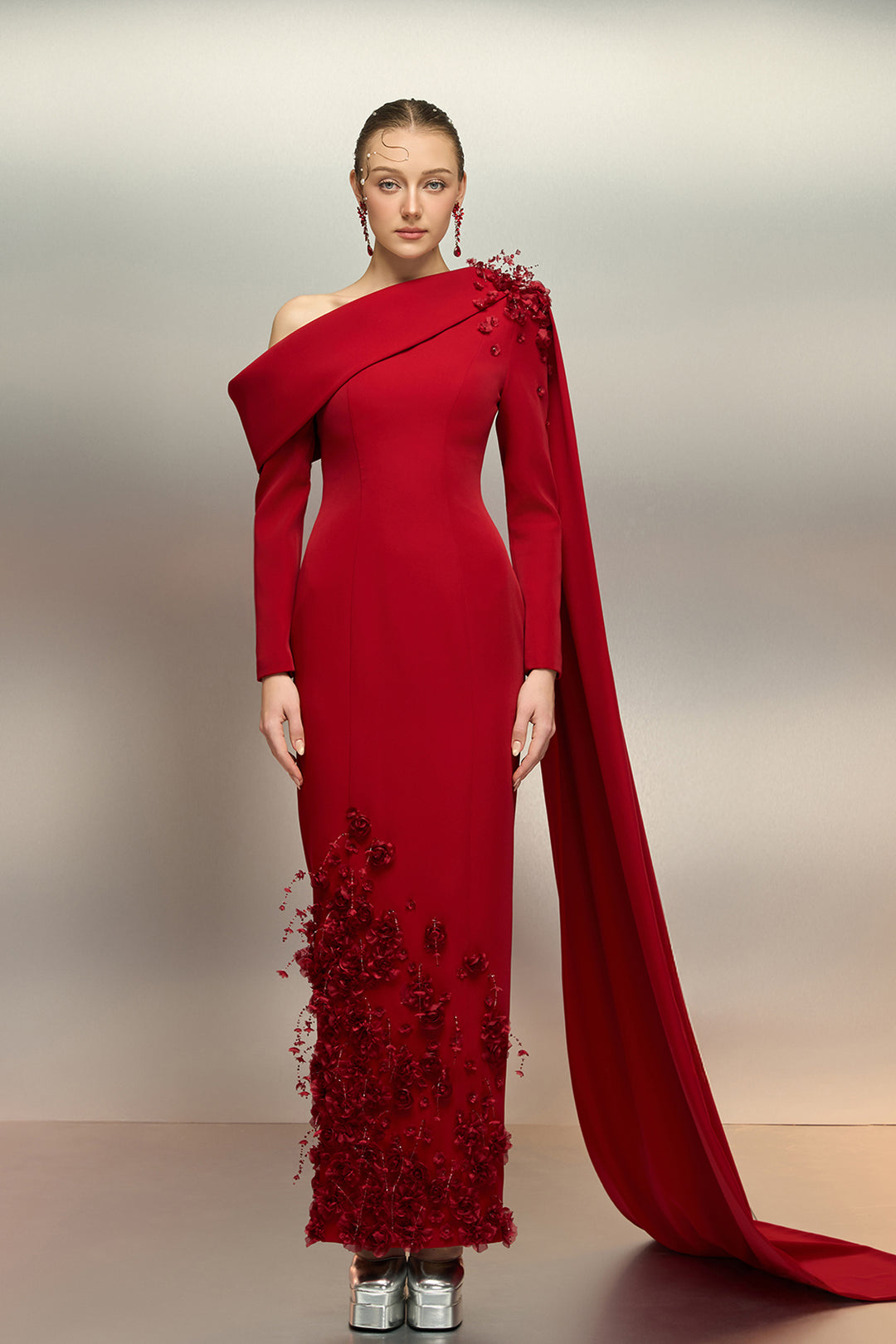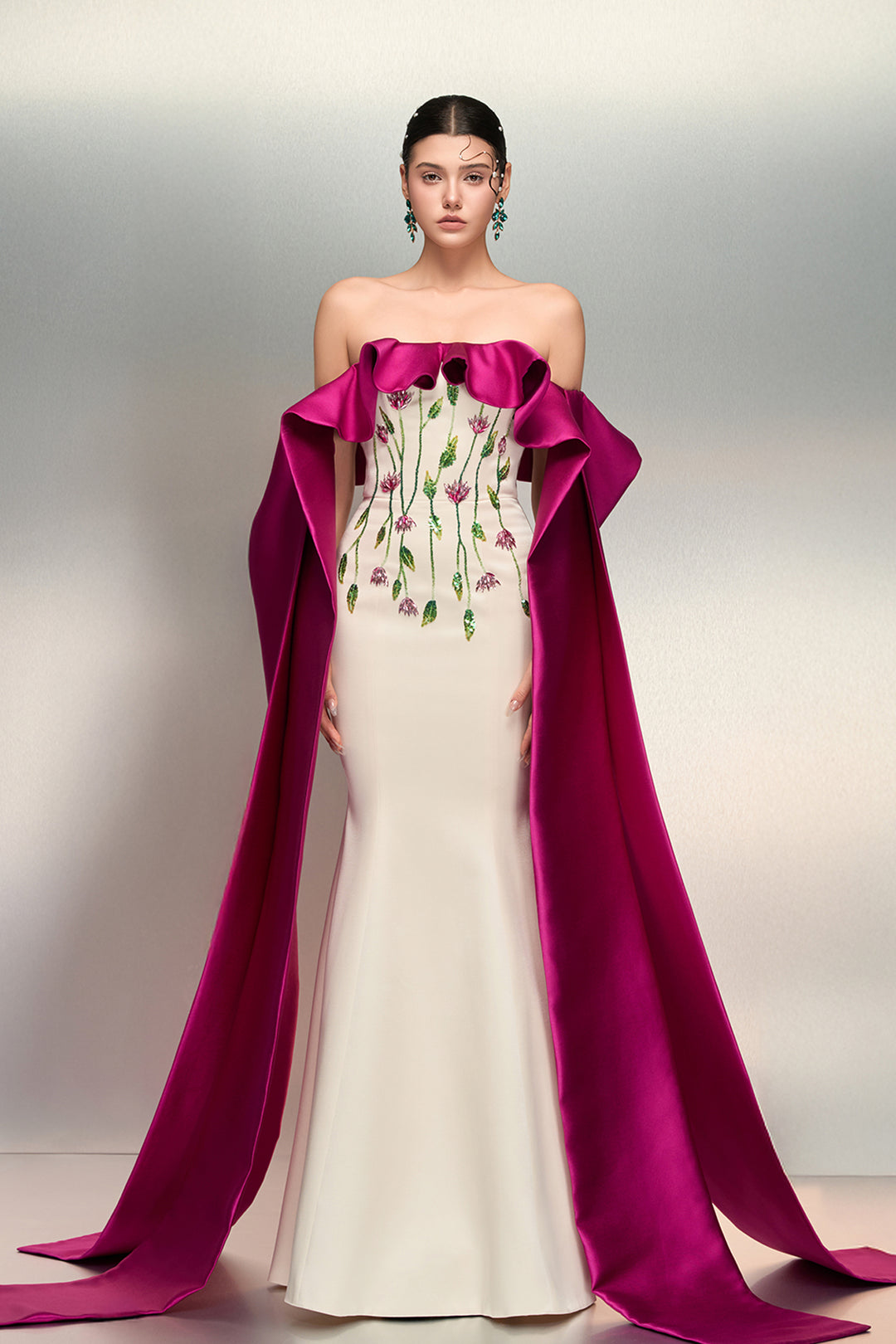 Crepe Long Dress with Crystal Floral Cape