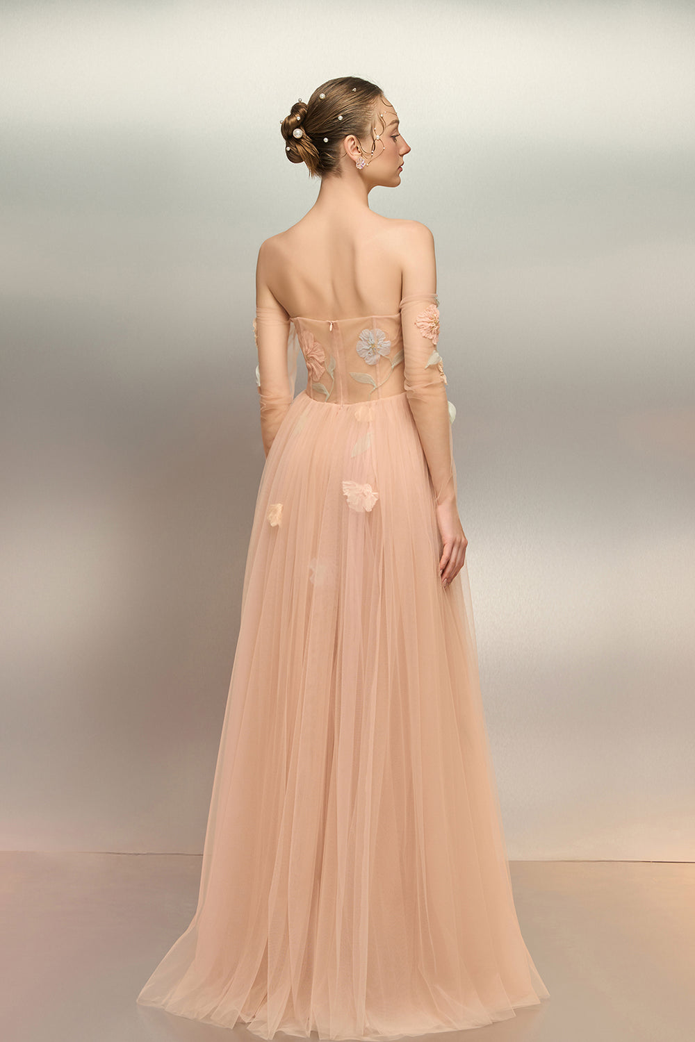 Strapless Dress with Floral-Inspired Bodice and Detachable Tulle Sash