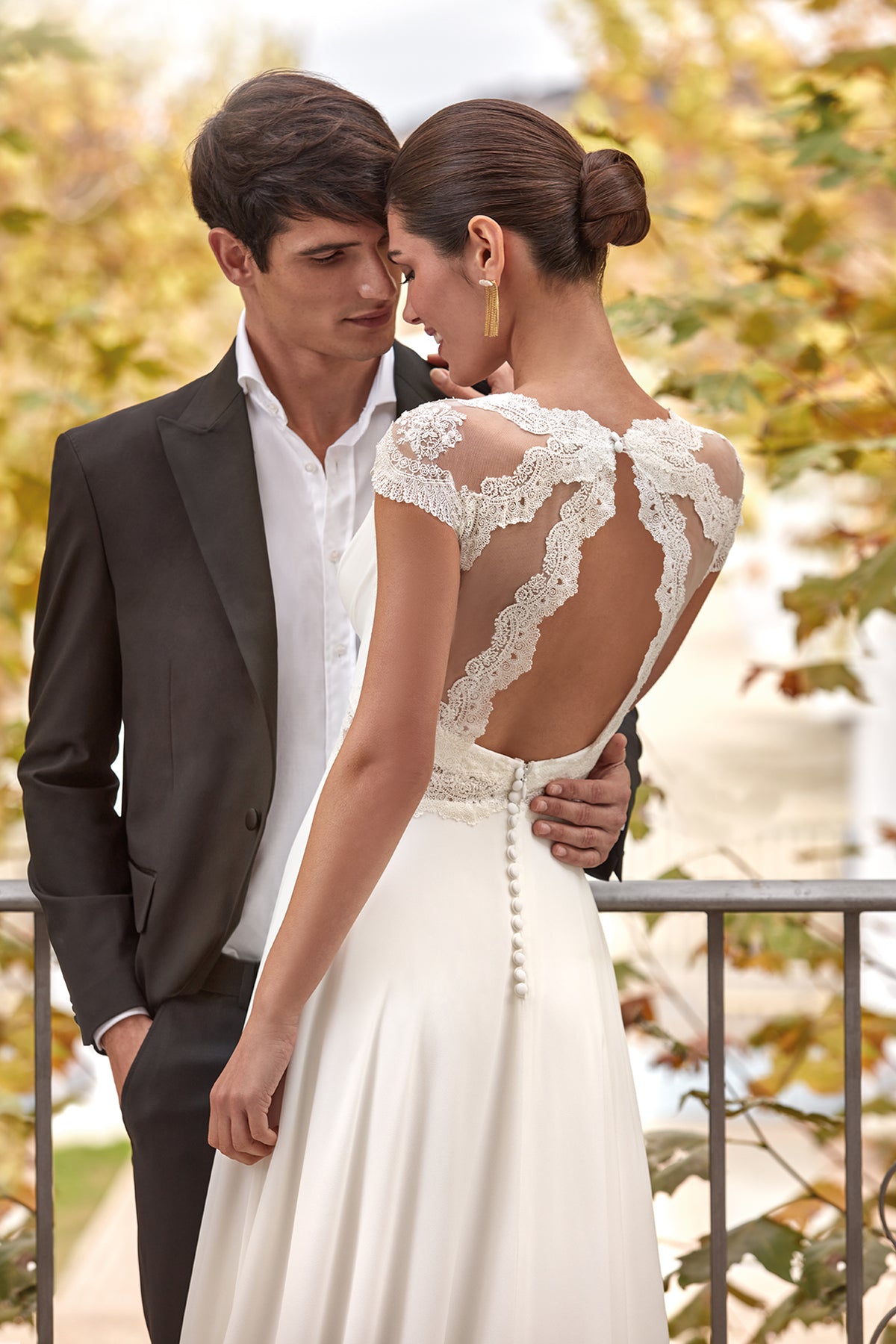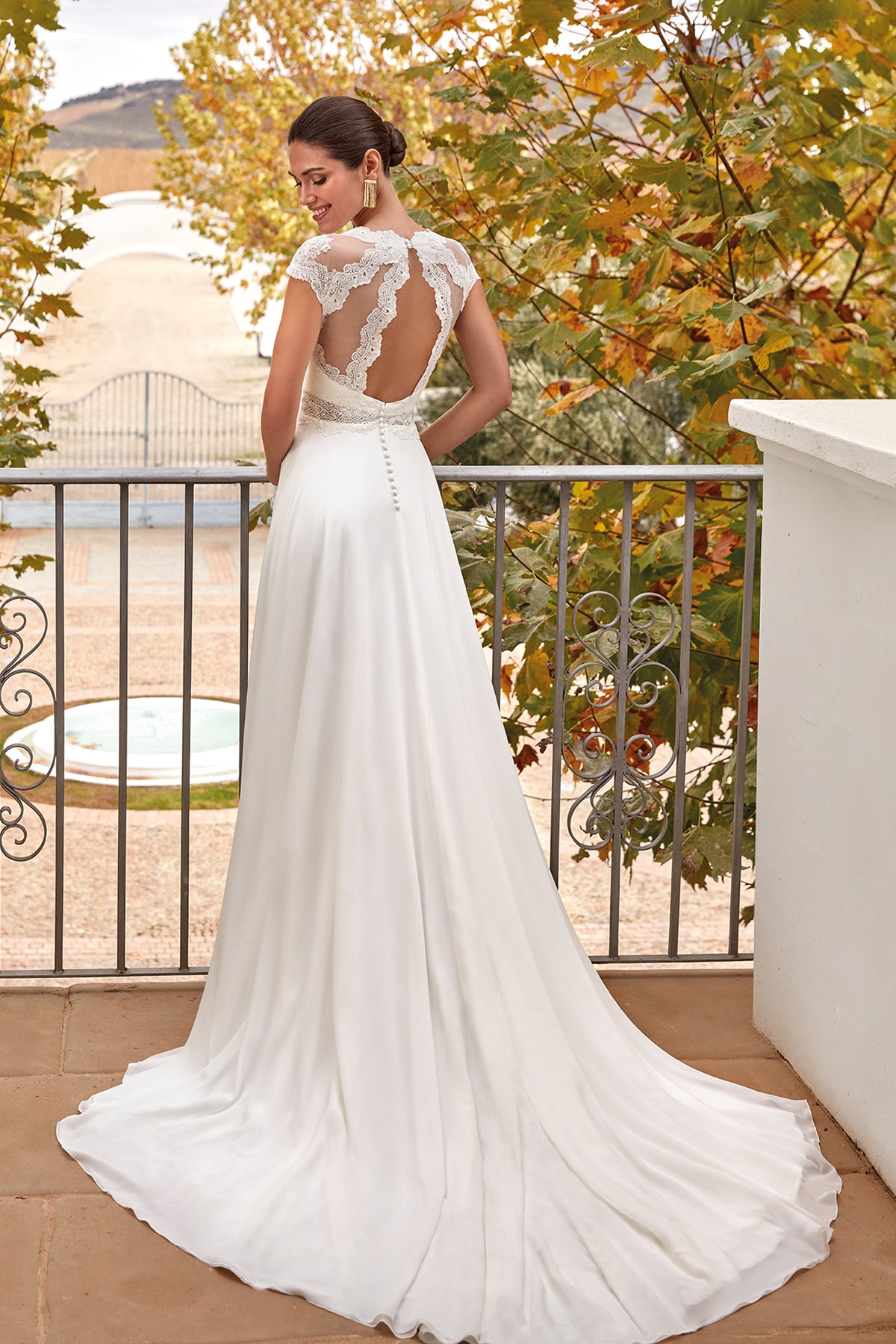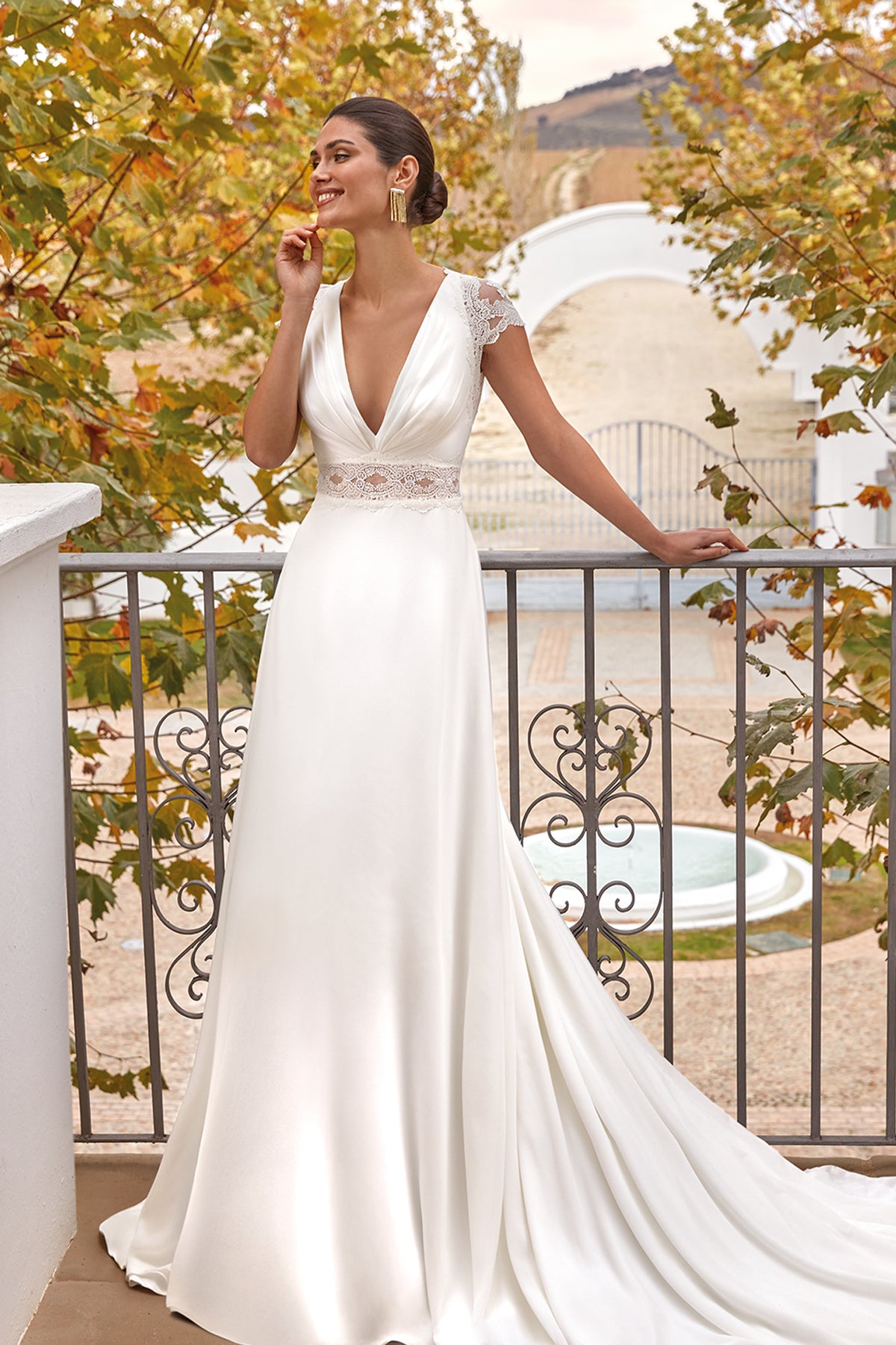 White A-line wedding dress. Featuring a bohemian style made of georgette and lace trims fluid and light skirt and a bodice with draped V-neckline. Complemented with a semi-transparent tulle waist and the tulle back are adorned with lace trims.