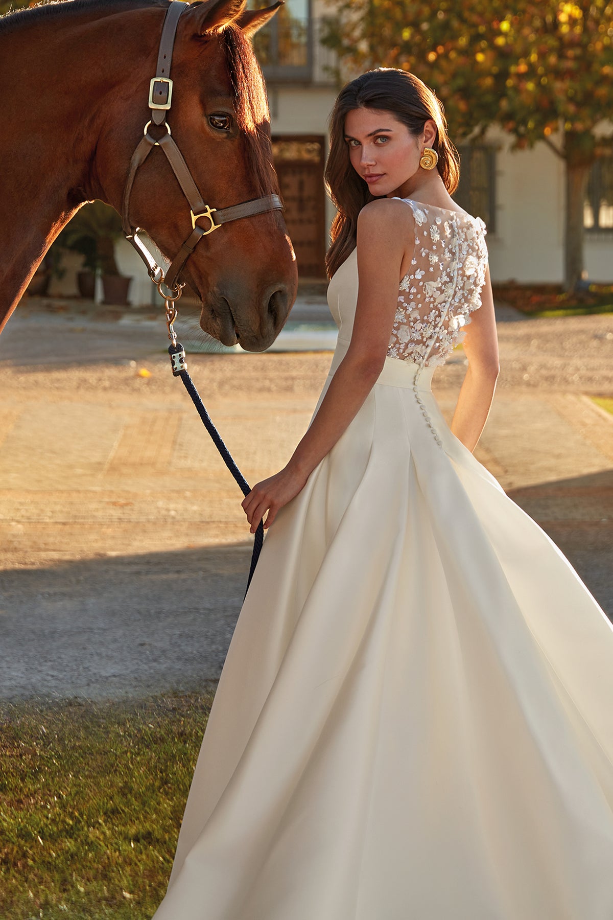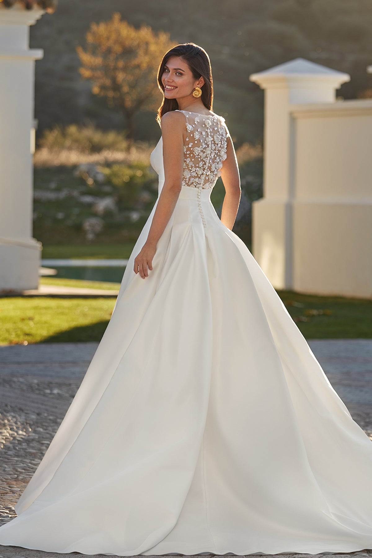 White a-line long silhouette dress. Featuring a beaded tulle fabric with 3D flowers and a deep V-neckline and a semi-transparent back in embroidered tulle. Complemented with a spectacular dress with a wide pleated skirt and a train.