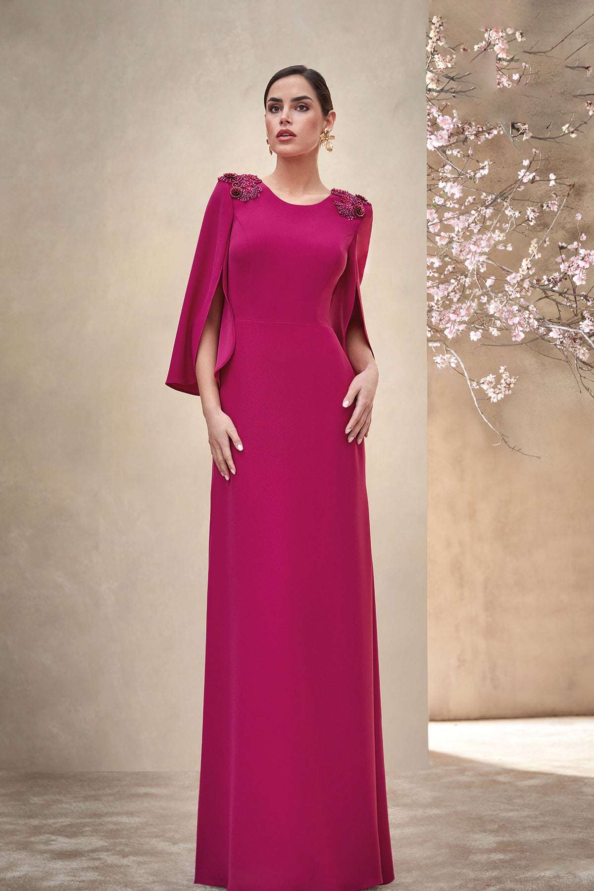 Fuchsia A-line dress in crepe. Featuring a Rhinestone shoulder pads and short cape sleeves.