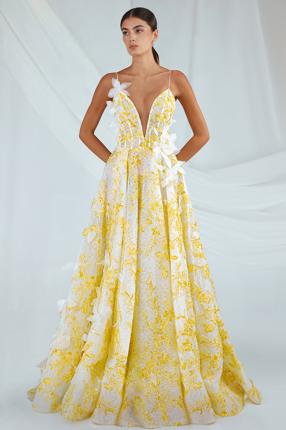 White and yellow floor-length dress. Featuring an embroidered lace, spaghetti straps, plunging neckline. Complemented with an open back, floral appliques, full skirt, and train.