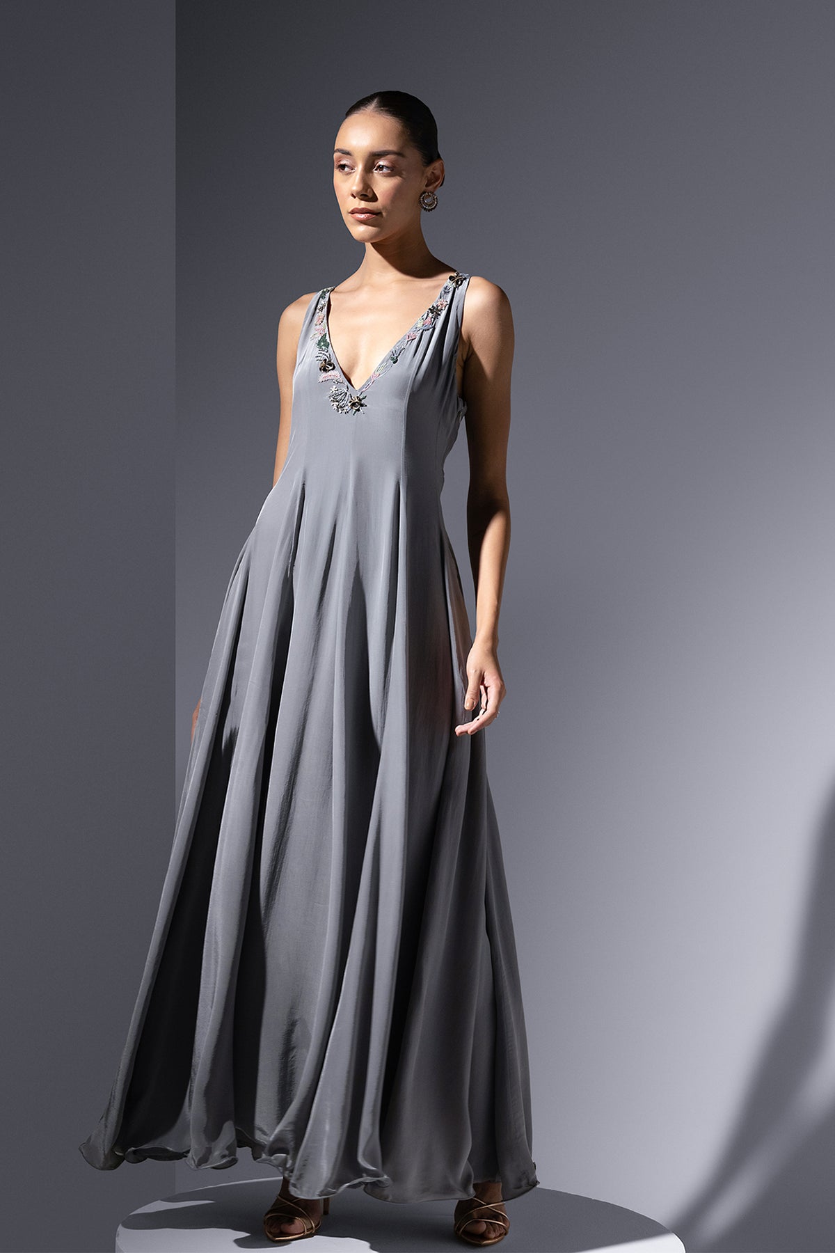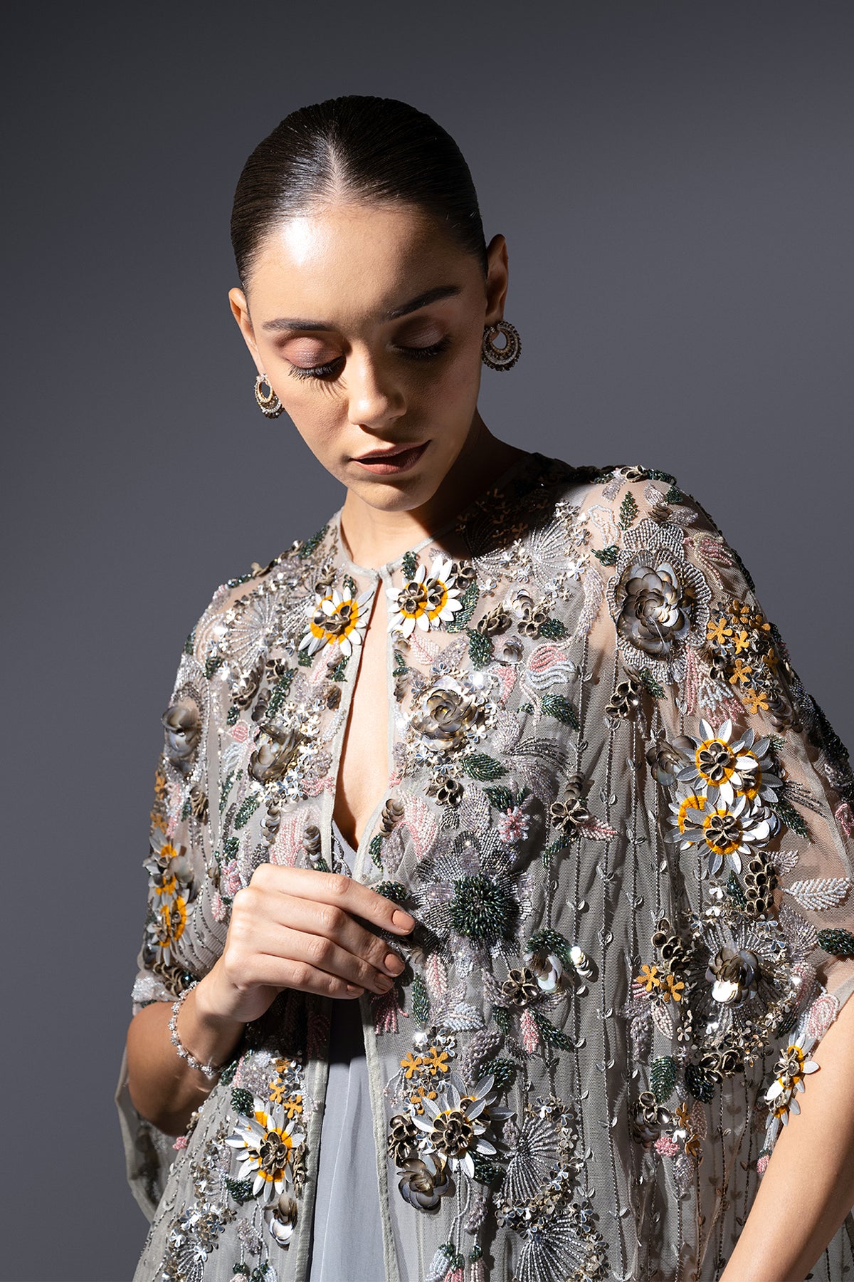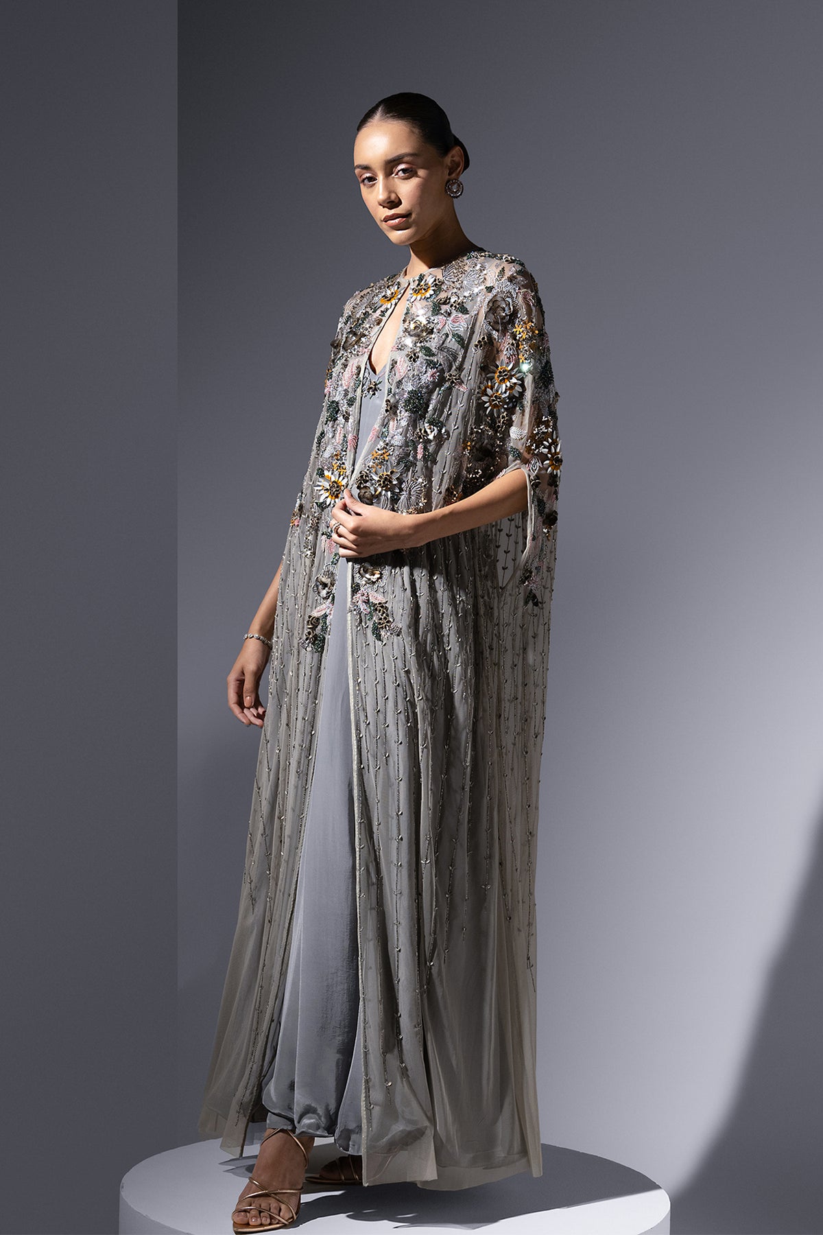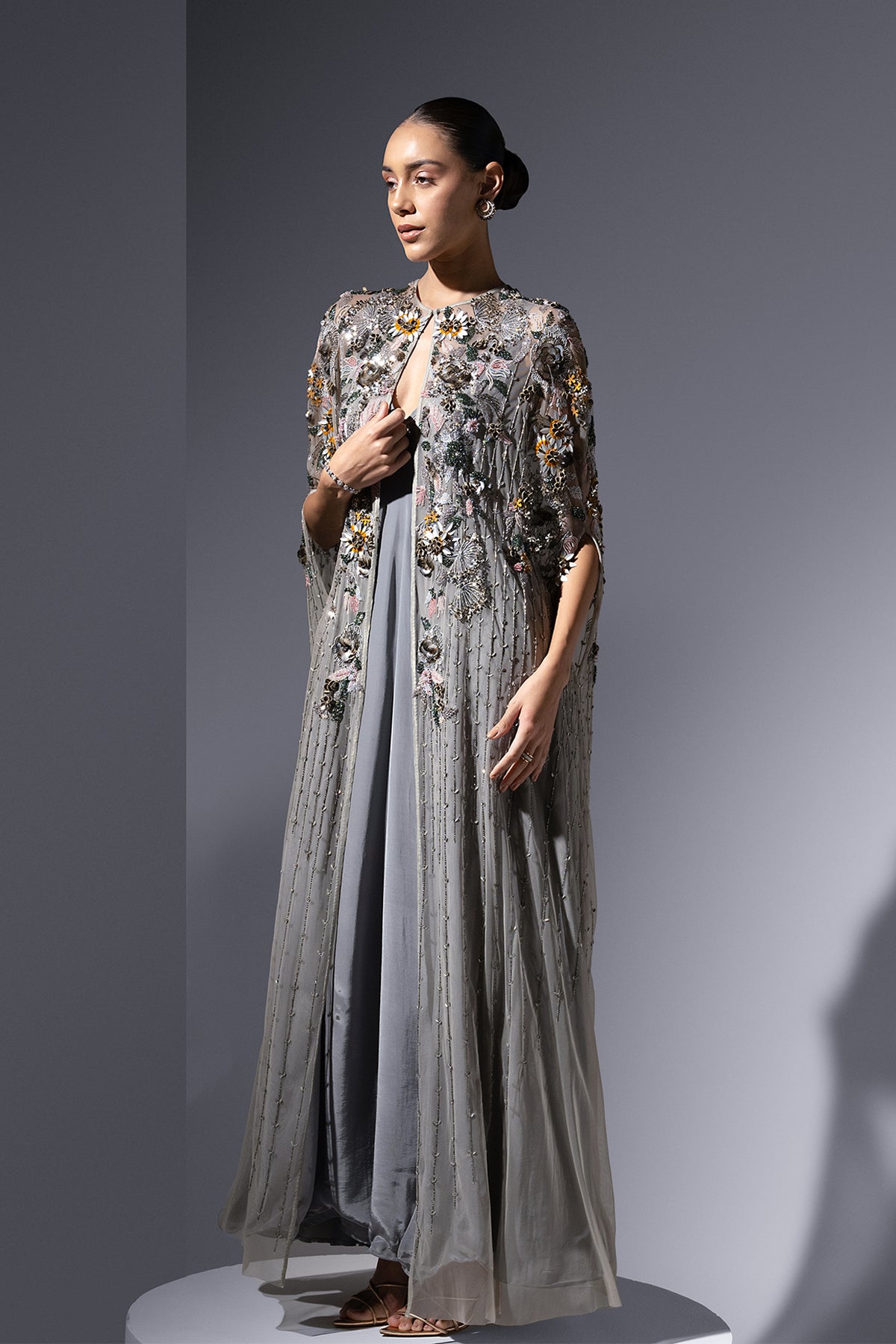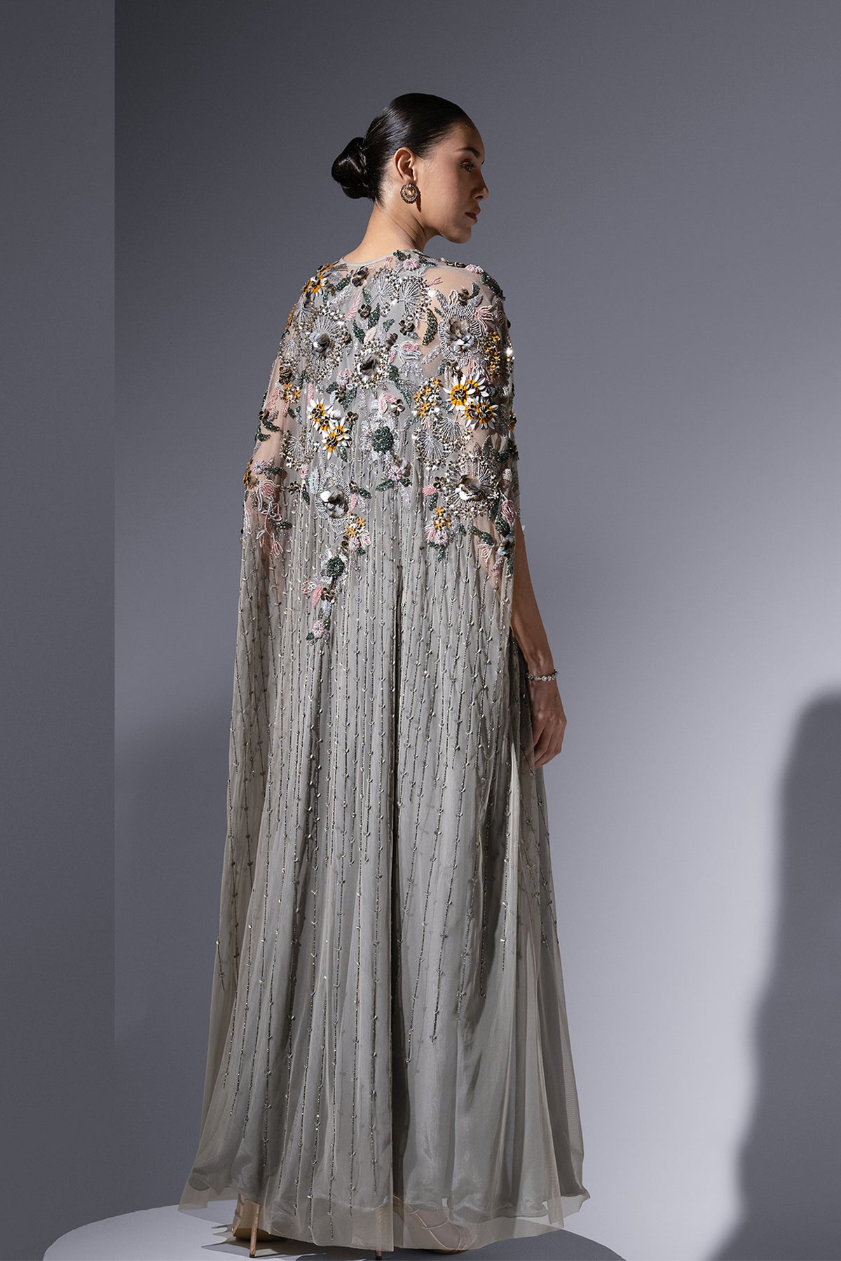 Ash grey soft mesh dress. Featuring a sultry plunging V-neckline with a stunning long cape that drapes gracefully, adorned with intricate floral motif embroidery.
