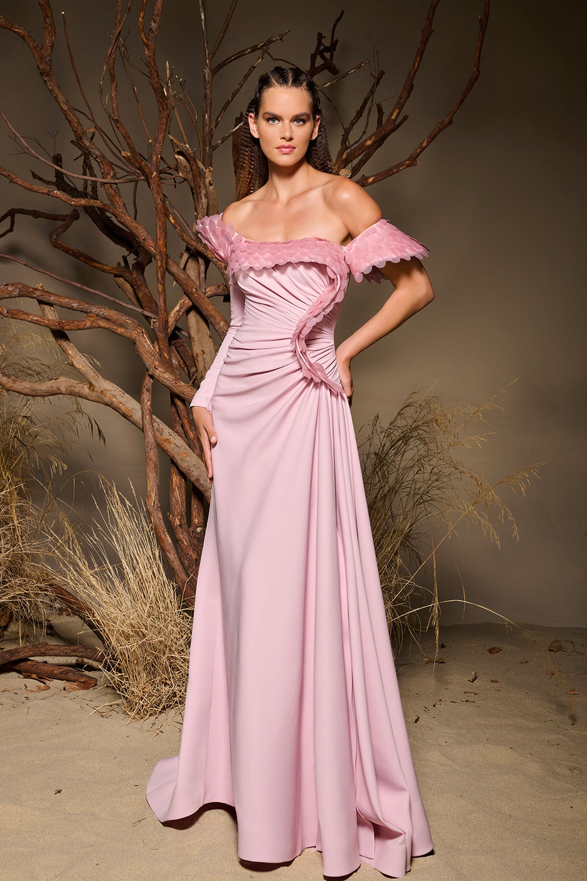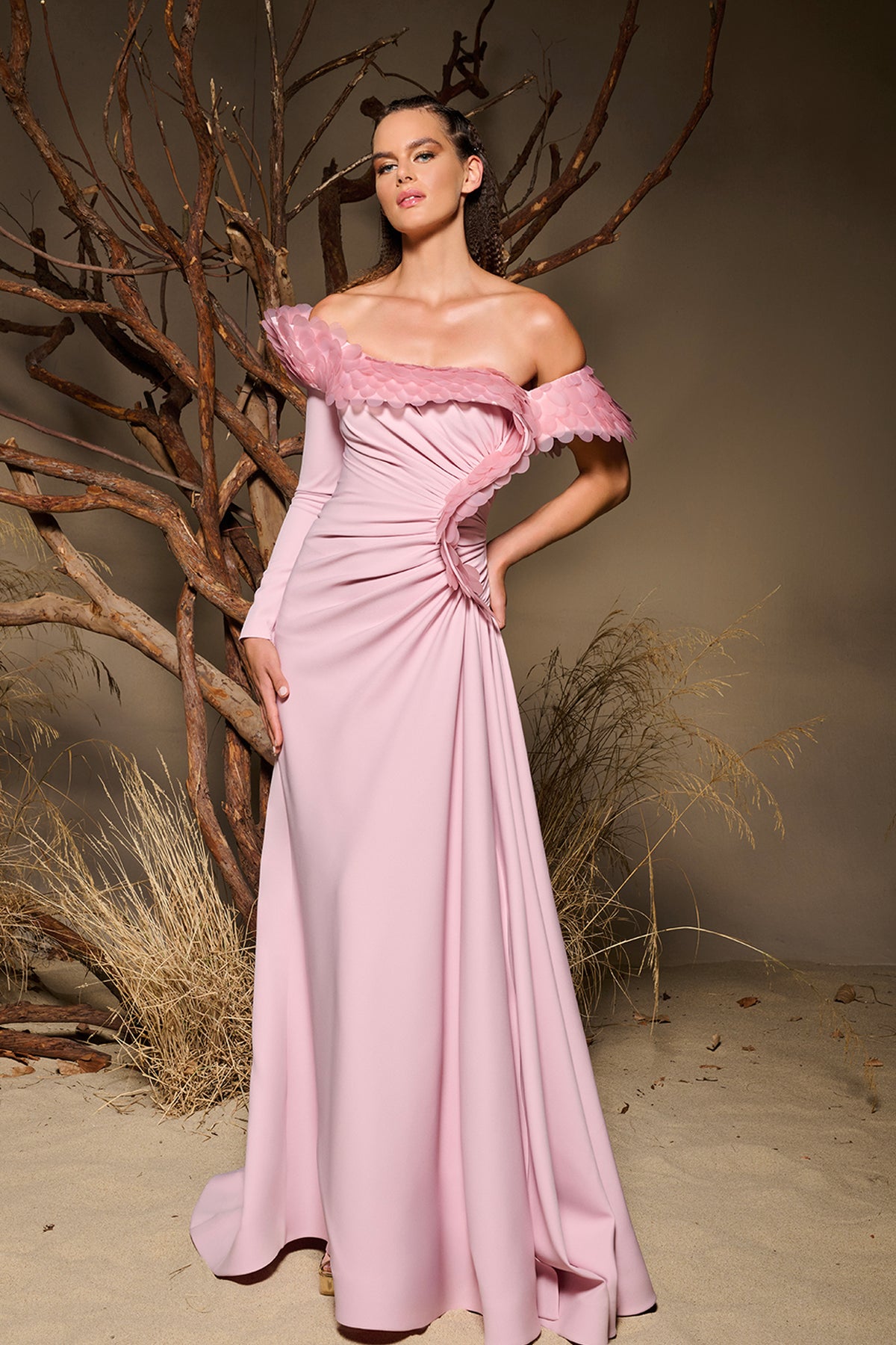 Light pink long dress. Featuring a bust adorned with oversized fish scale inspired embellishments forming wavy textured neckline that frames the shoulders with an off-the-shoulder neckline. Complemented with asymmetrical across the waist sculpting the silhouette with fluid.