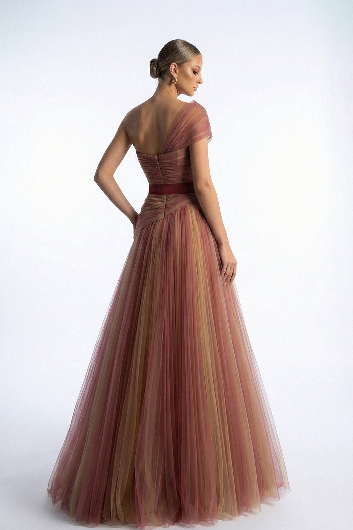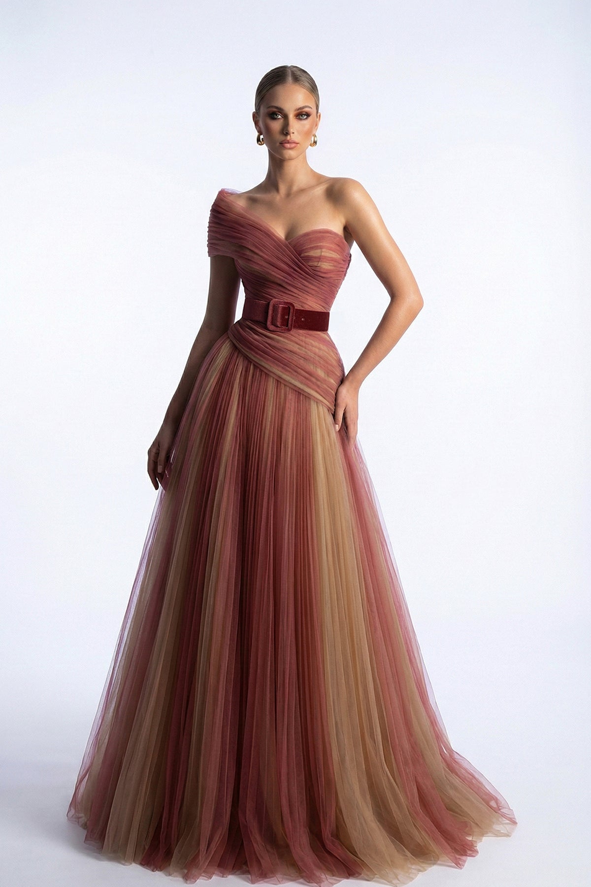 Beige a-line long dress. Featuring one-off-the-shoulder neckline that gracefully sweeps across the collarbones with a waist is cinched by a wide belt band.