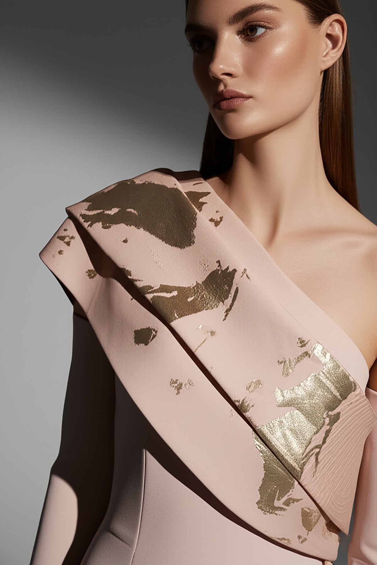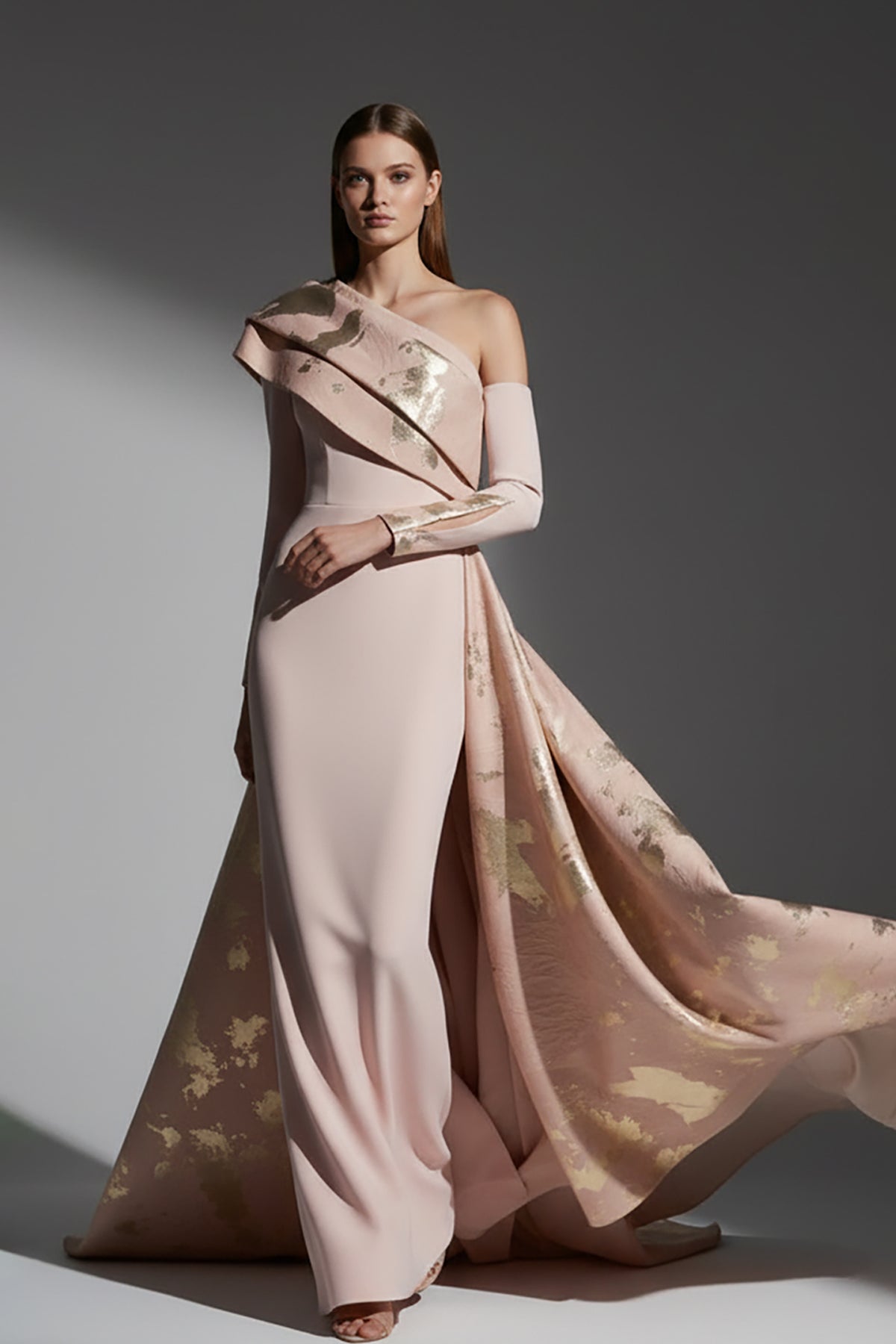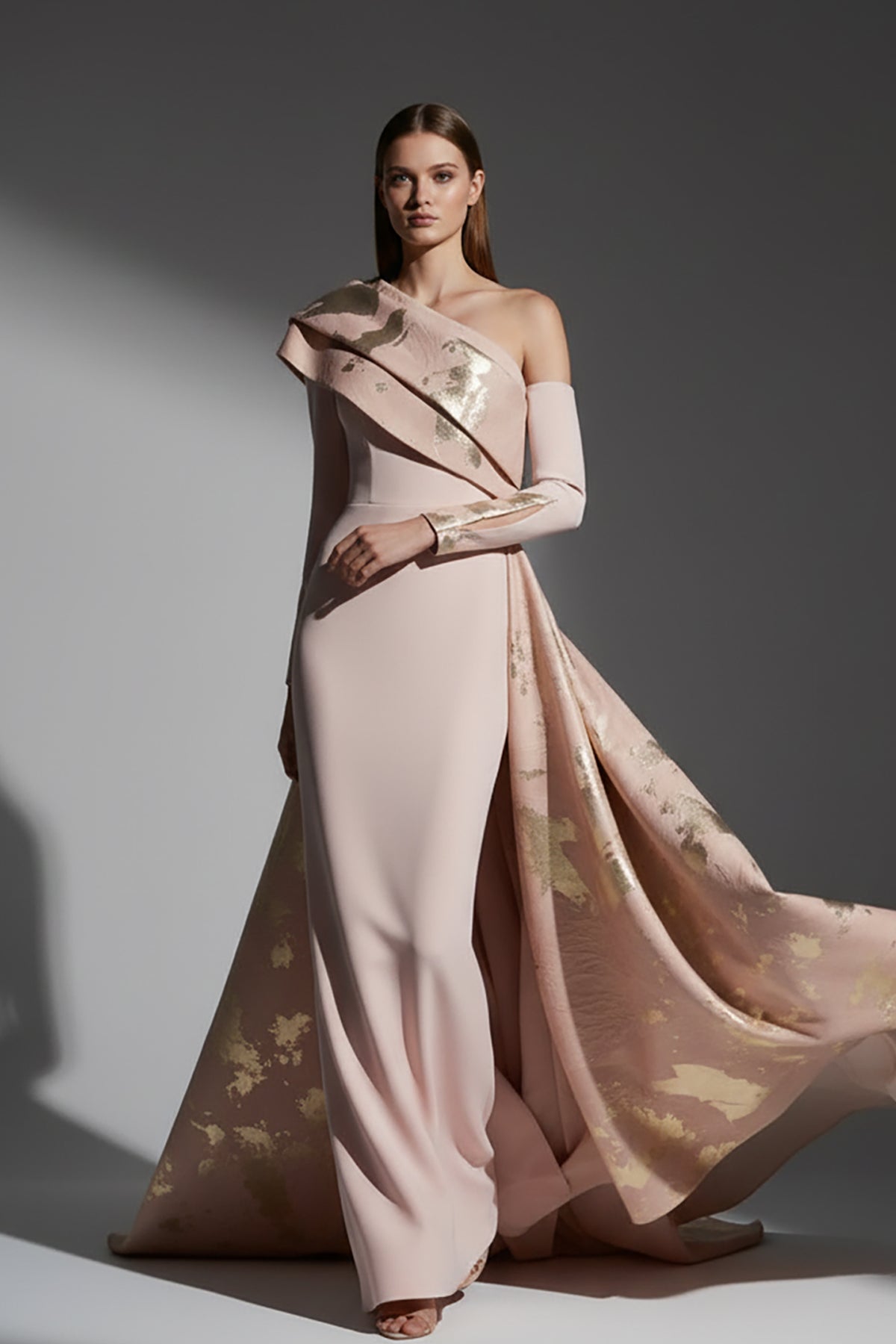 Blush pink one-shoulder long dress. Featuring an asymmetric neckline with a flower textured jacquard overlay with a fitted silhouette flows into a floor-length skirt with a side drape and train in matching blush and gold fabric.