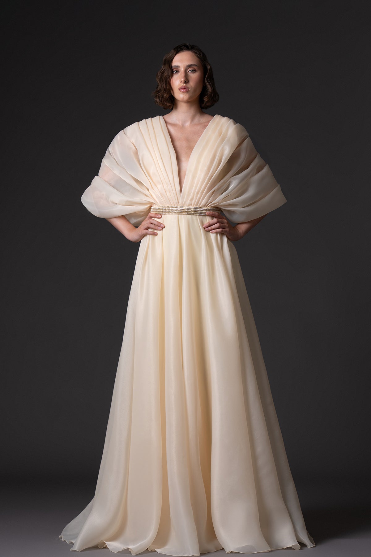 Buttercup yellow organza long dress. Featuring a voluminous sleeves with baguette embroidered belt and a-line silhouette.