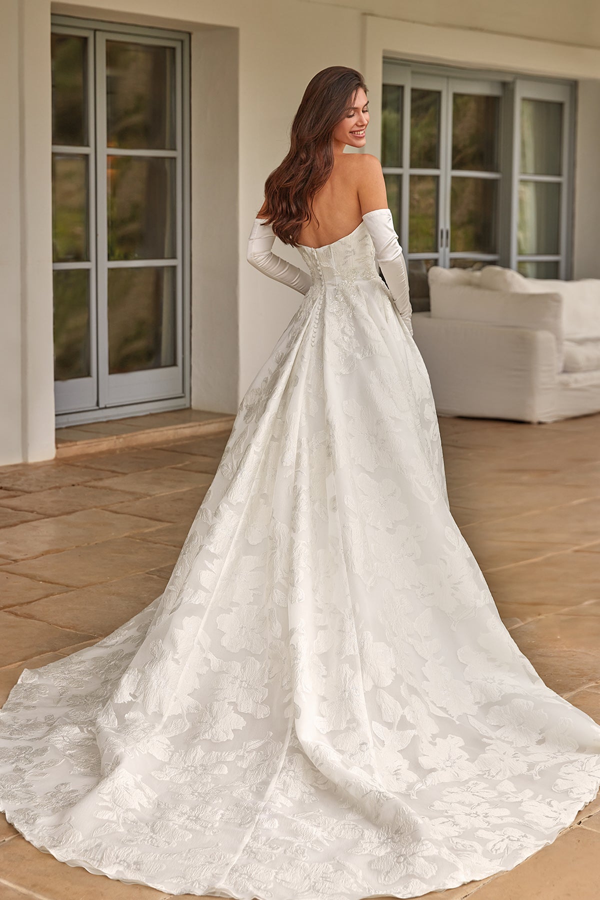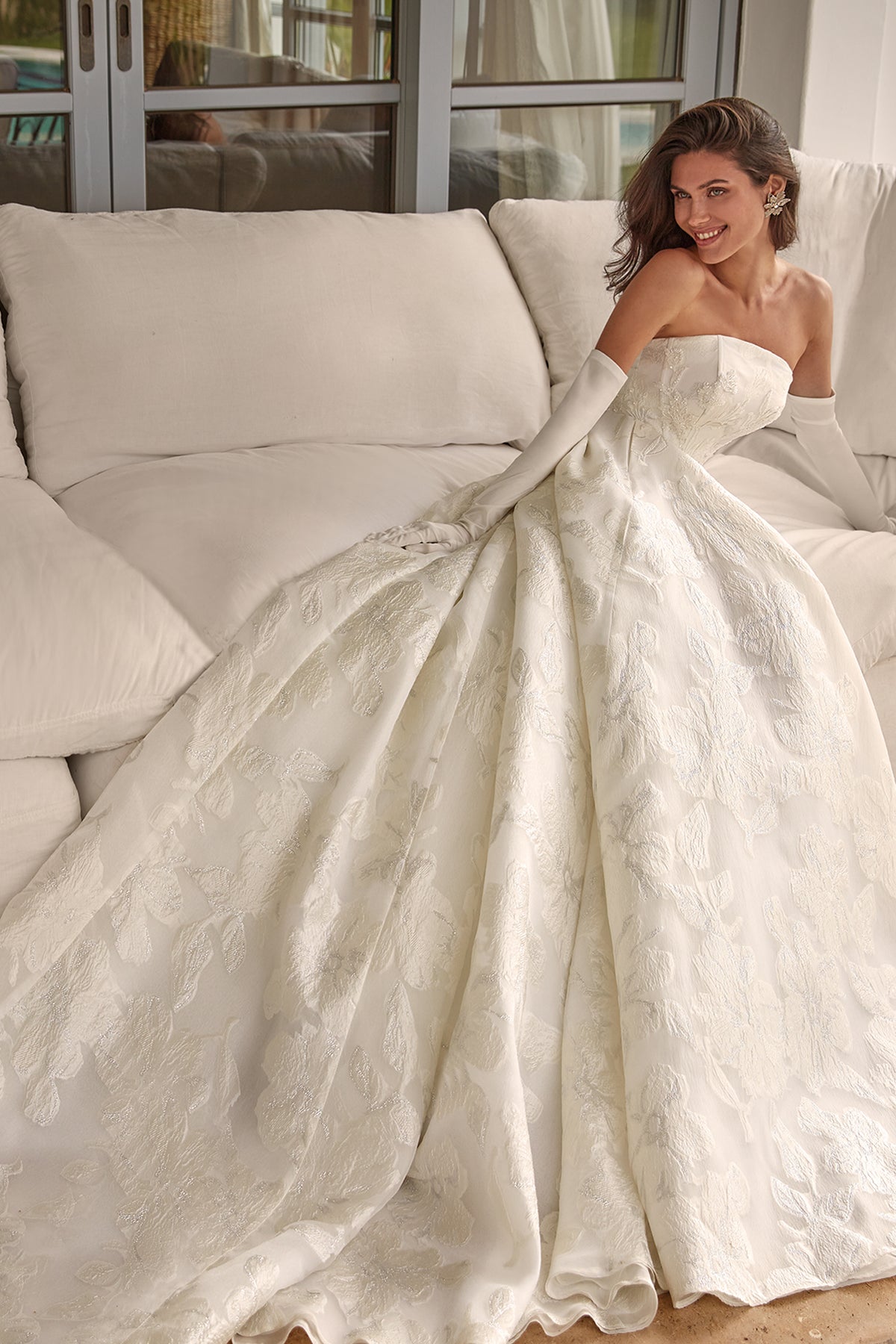 White princess wedding dress. Featuring a jacquard organza with a strapless bodice a skirt with pockets and a train. Complemented with a design artisanal crystal-embroidered appliques that adorn the waist and the side of the skirt.