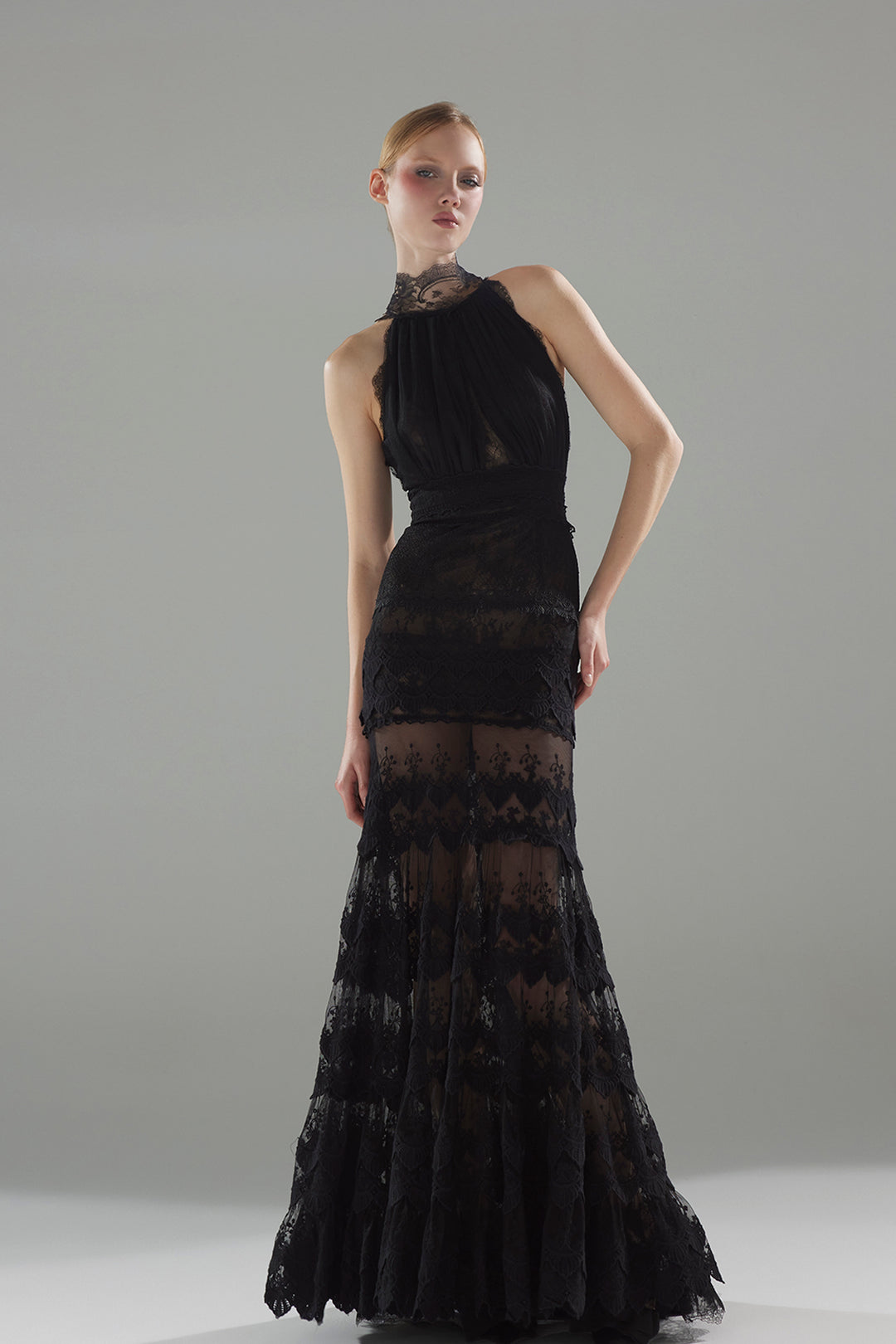 Long Tulle Dress with Embroidered Halter and Dotted Overskirt