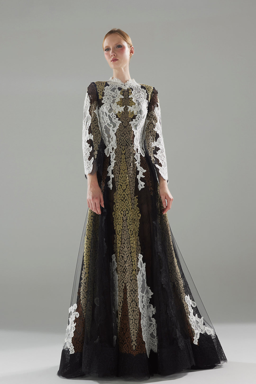 Long Beaded Embroidered Dress with Layered Tulle Skirt