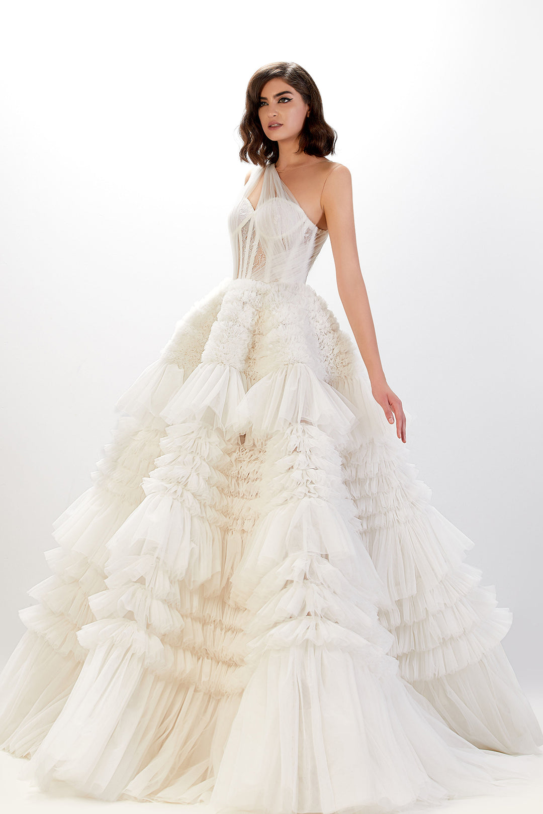 Structured Bodice Dress with Ruffles and Sculptural Detailing