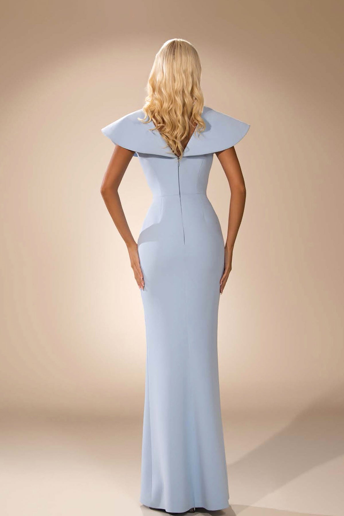 Blue crepe long dress. Featuring mermaid embroidery with appliqués along the bodice and hip in a brighter or silver-tone for contrast. Complemented with a fitted waist precision darts and contouring create a sculpted silhouette.