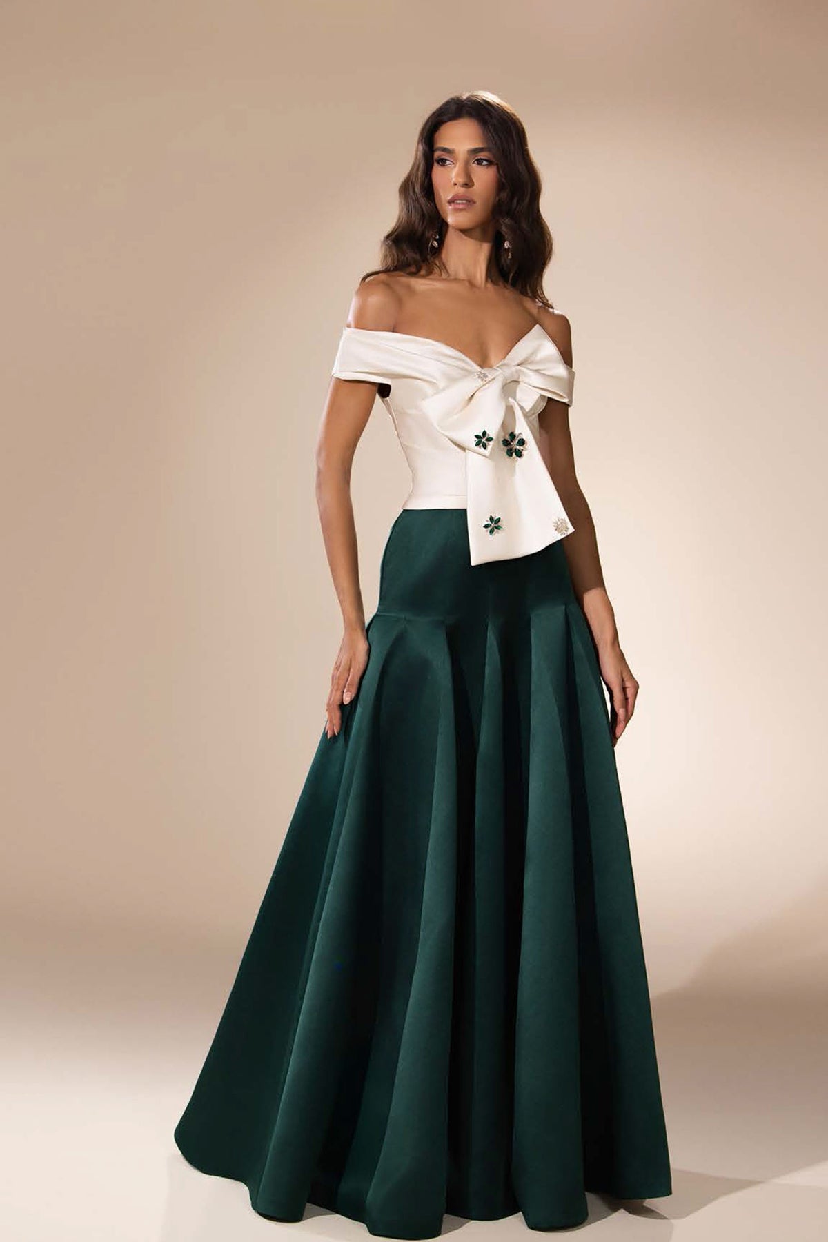Multi A-line satin long dress. Featuring a waist and torso structured pleats skirt that creates generous volume and a fluid. Complemented with an off-the-shoulder neckline, a structured shoulder wrap that drapes gracefully over the arms.