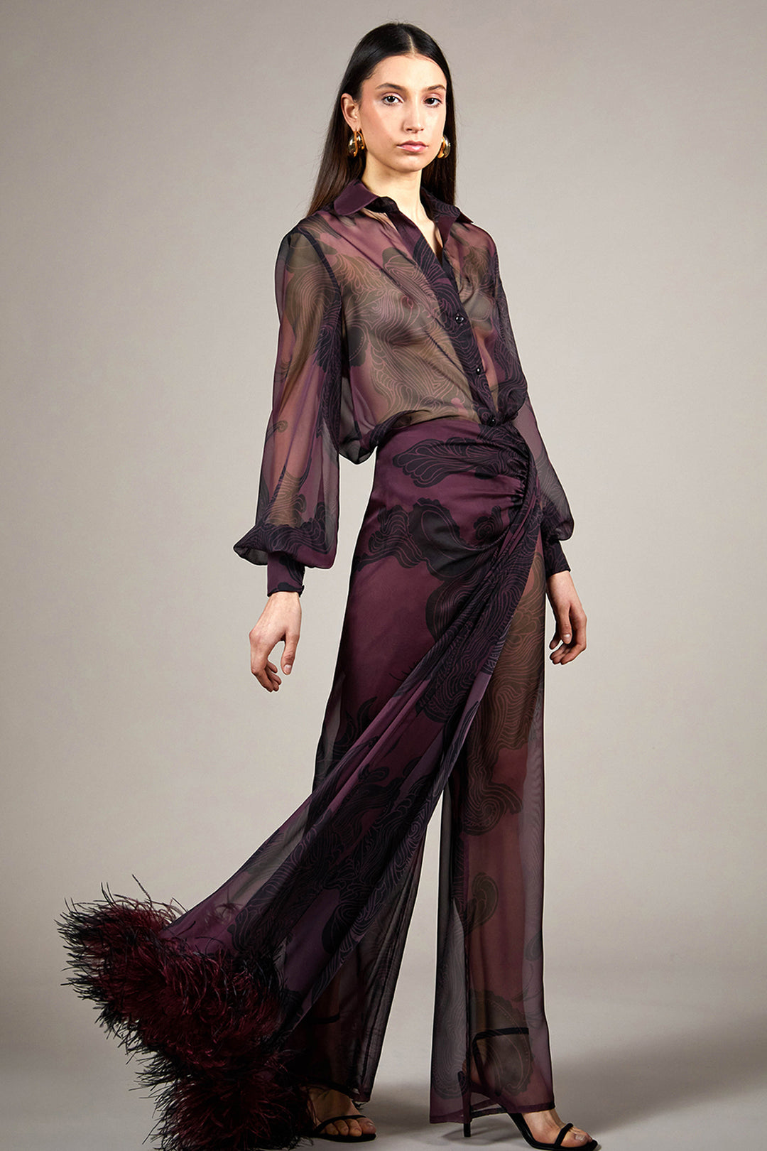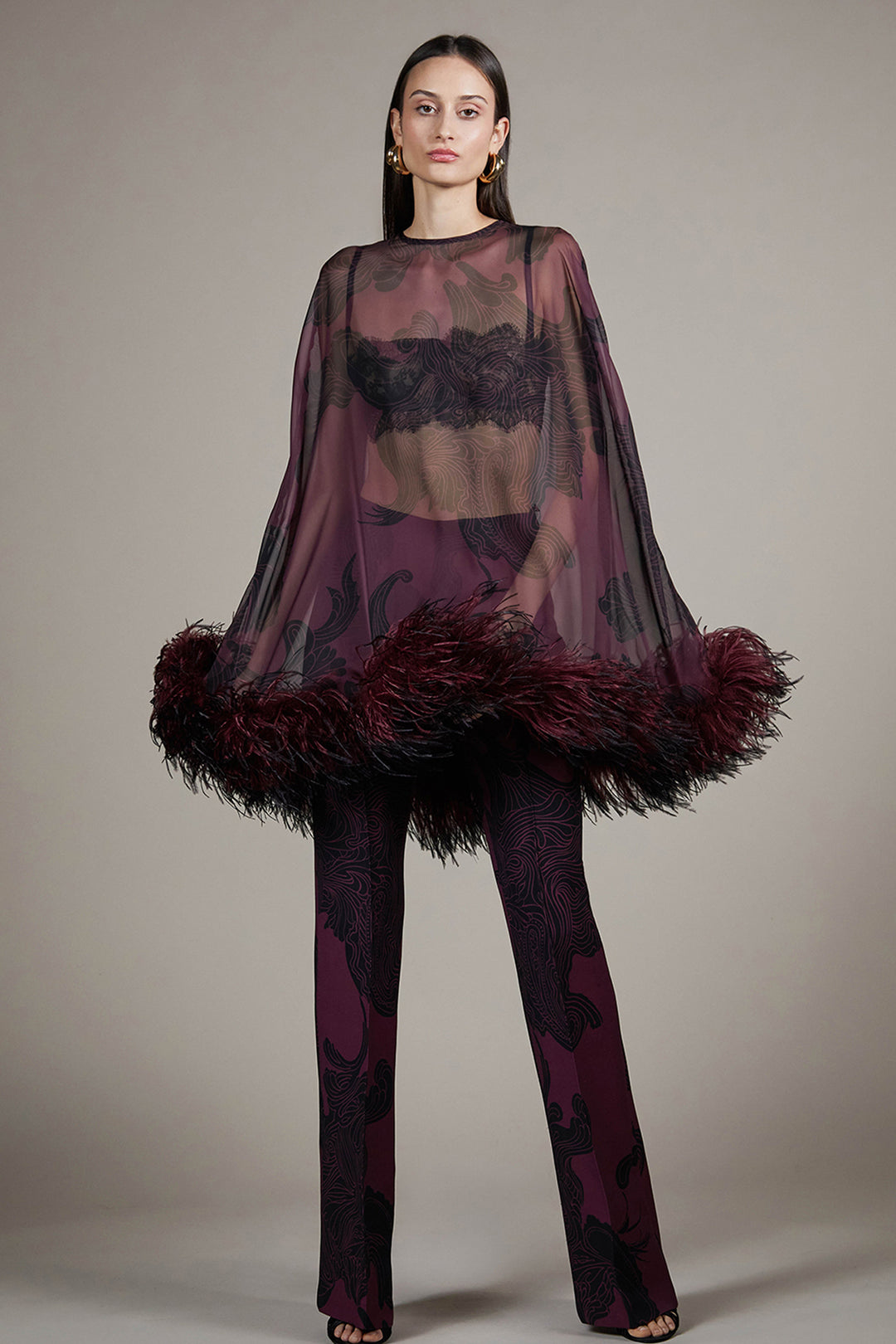 Feather-Trimmed Sheer Cape and Trouser Set