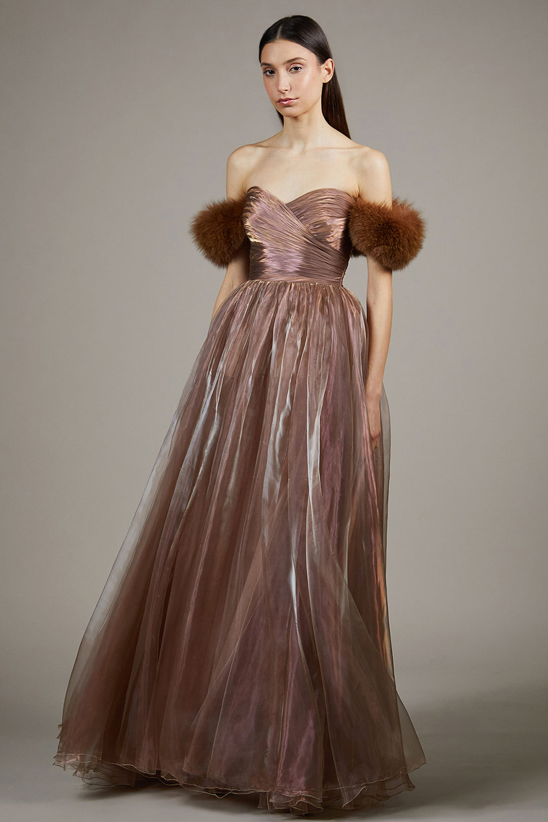 Iridescent Organza Fur-Trimmed Dress