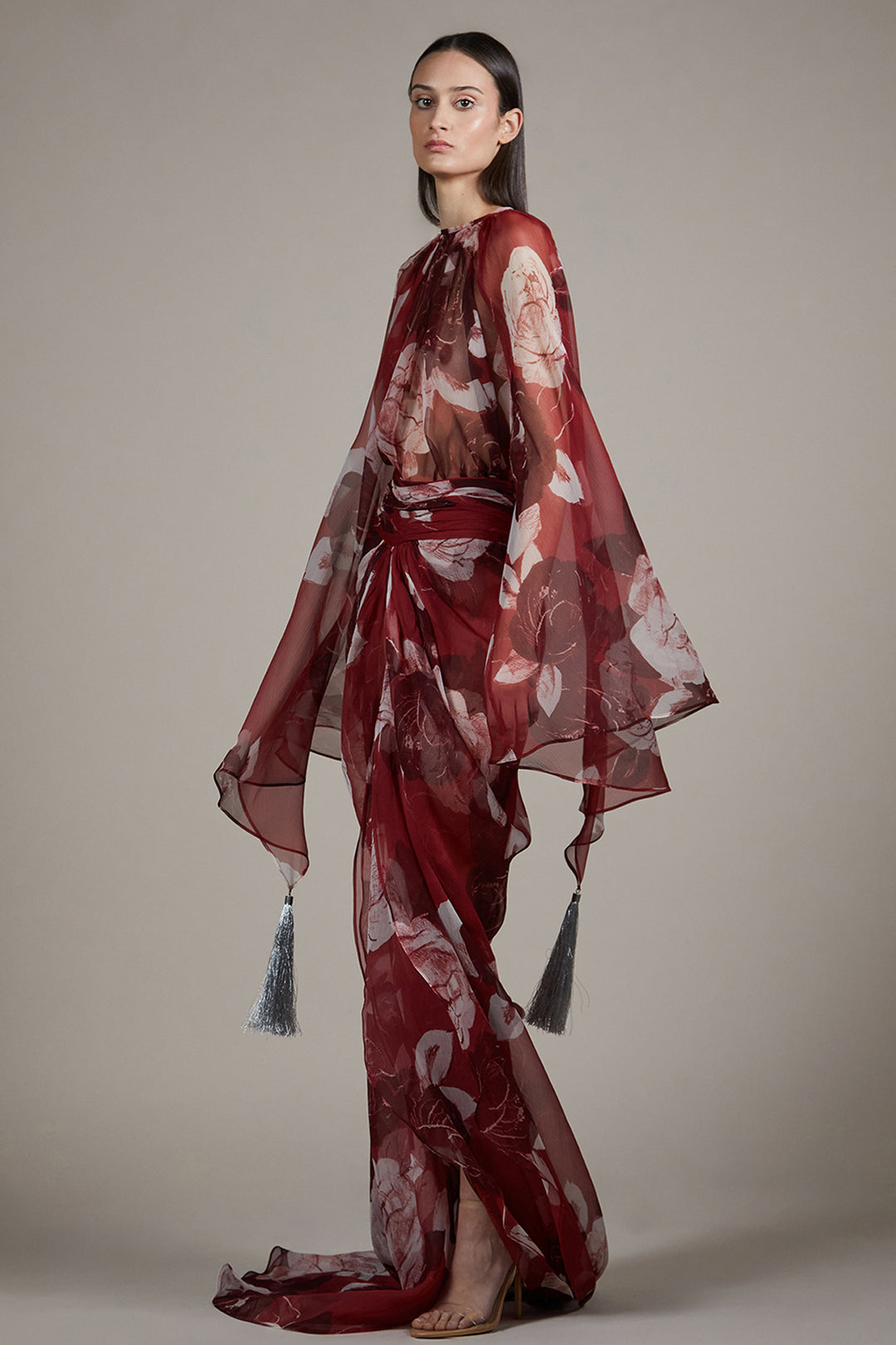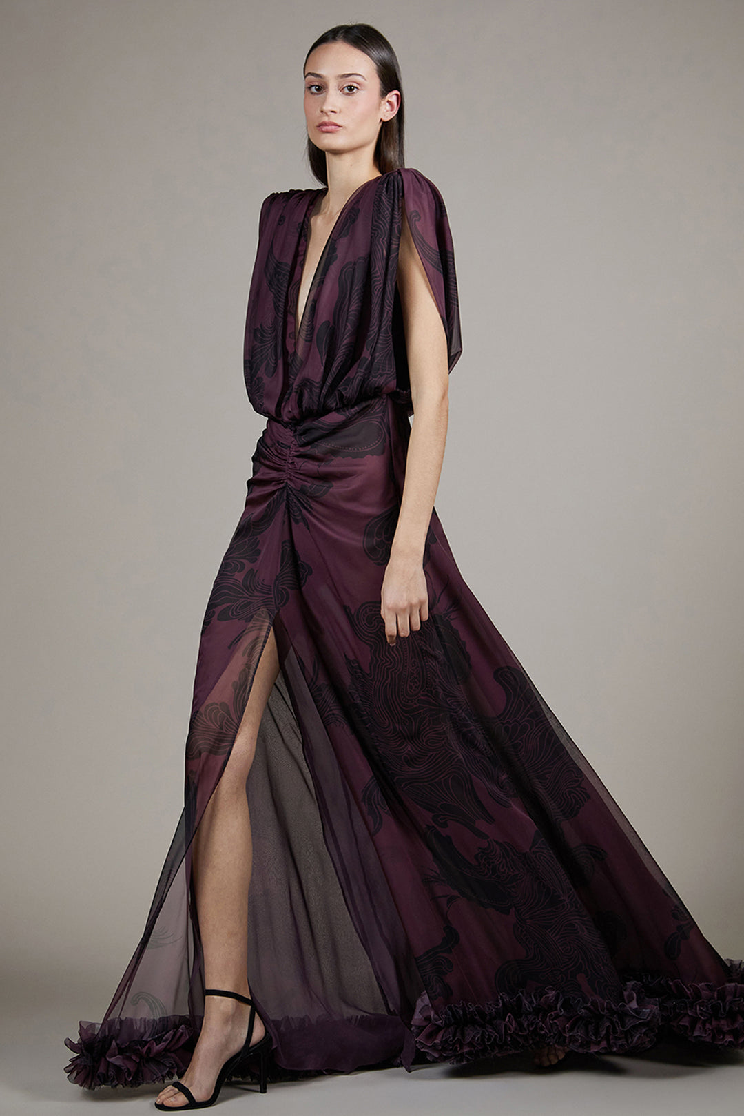 Draped Wing-Sleeved Chiffon Dress