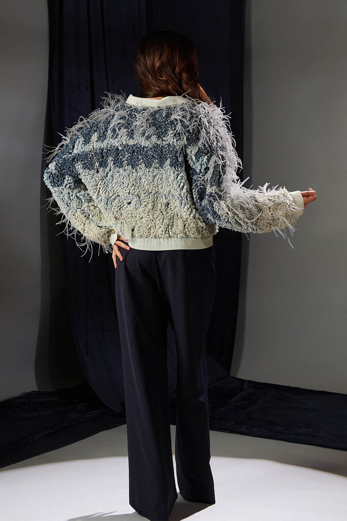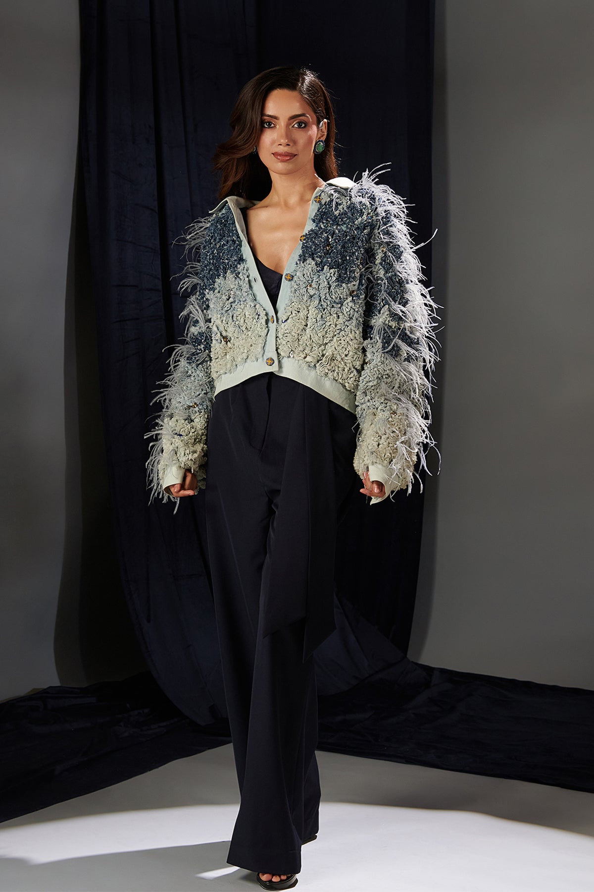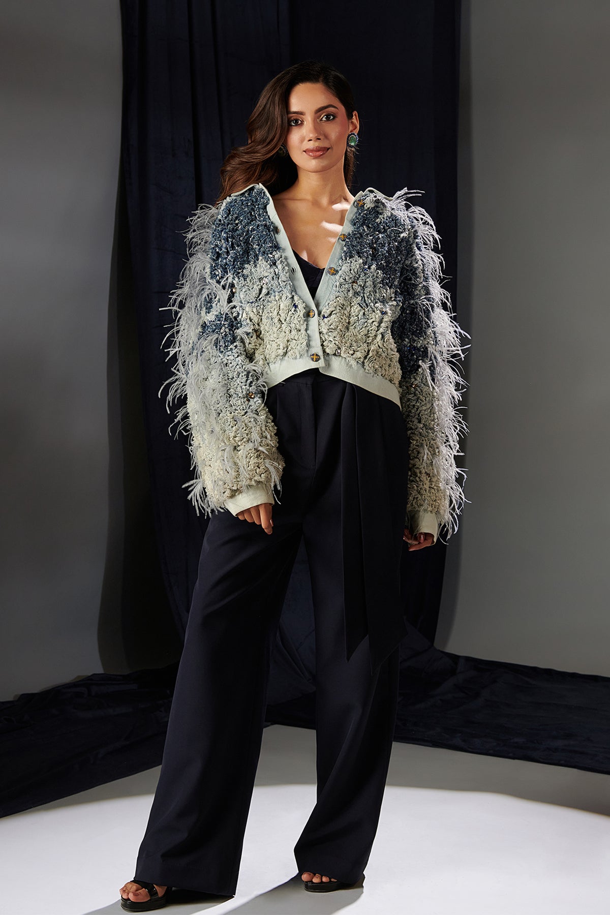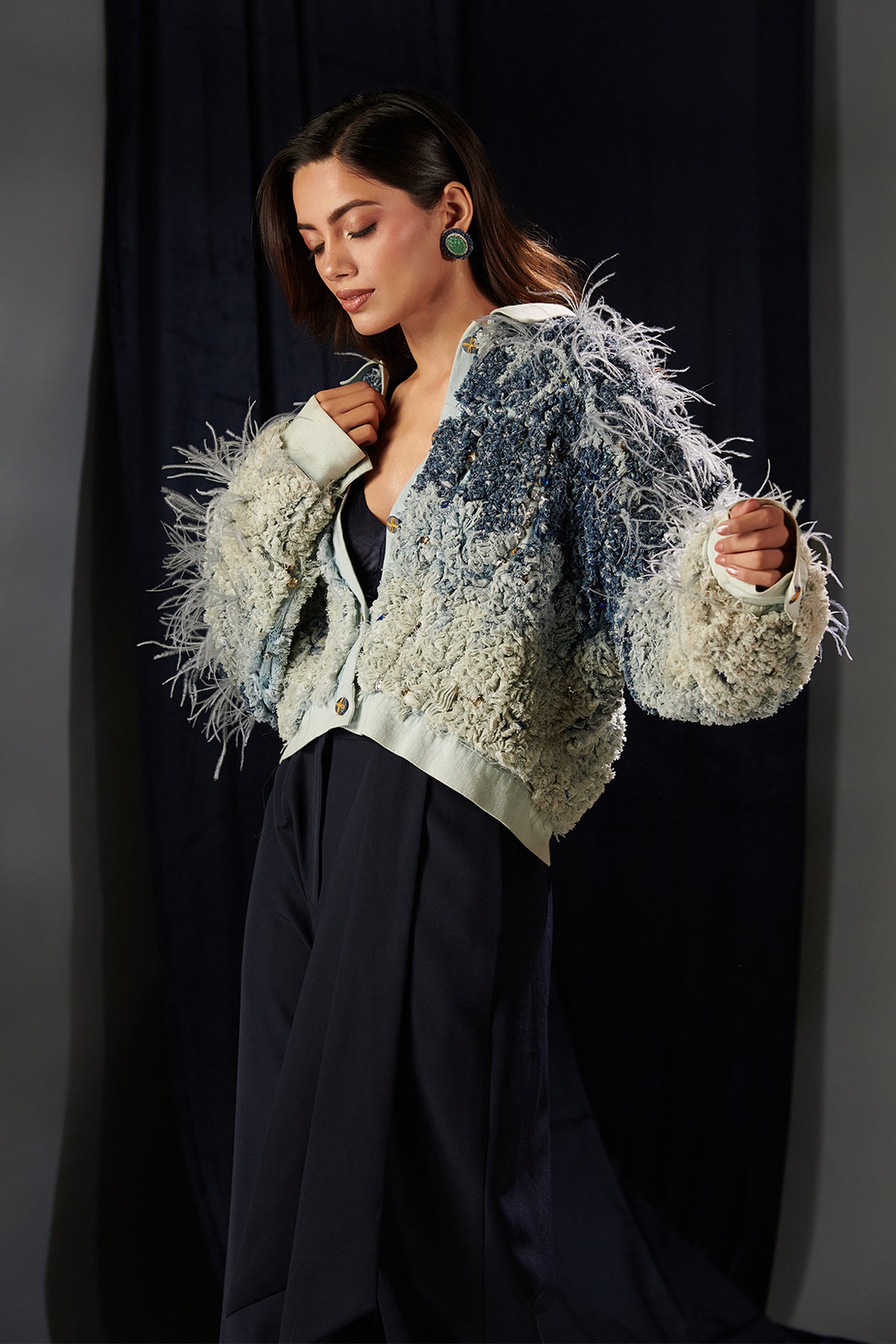 Navy crepe flared Three-piece. Featuring a casual chic with our frayed denim jacket, dazzling crystal embellishments. Complemented with playful edges and shimmering accents blends effortlessly, creating a standout piece that's as fun as it is fabulous.