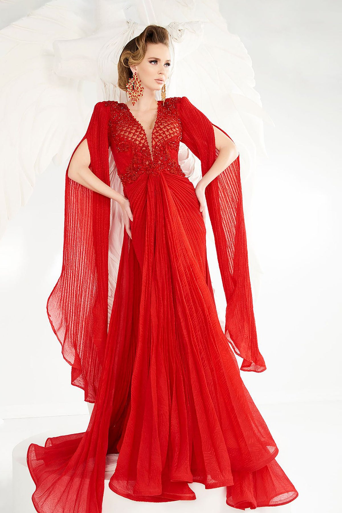 Red tulle floor-sweeping dress. Featuring a cape-like elements with neckline itself is a deep plunging-V.