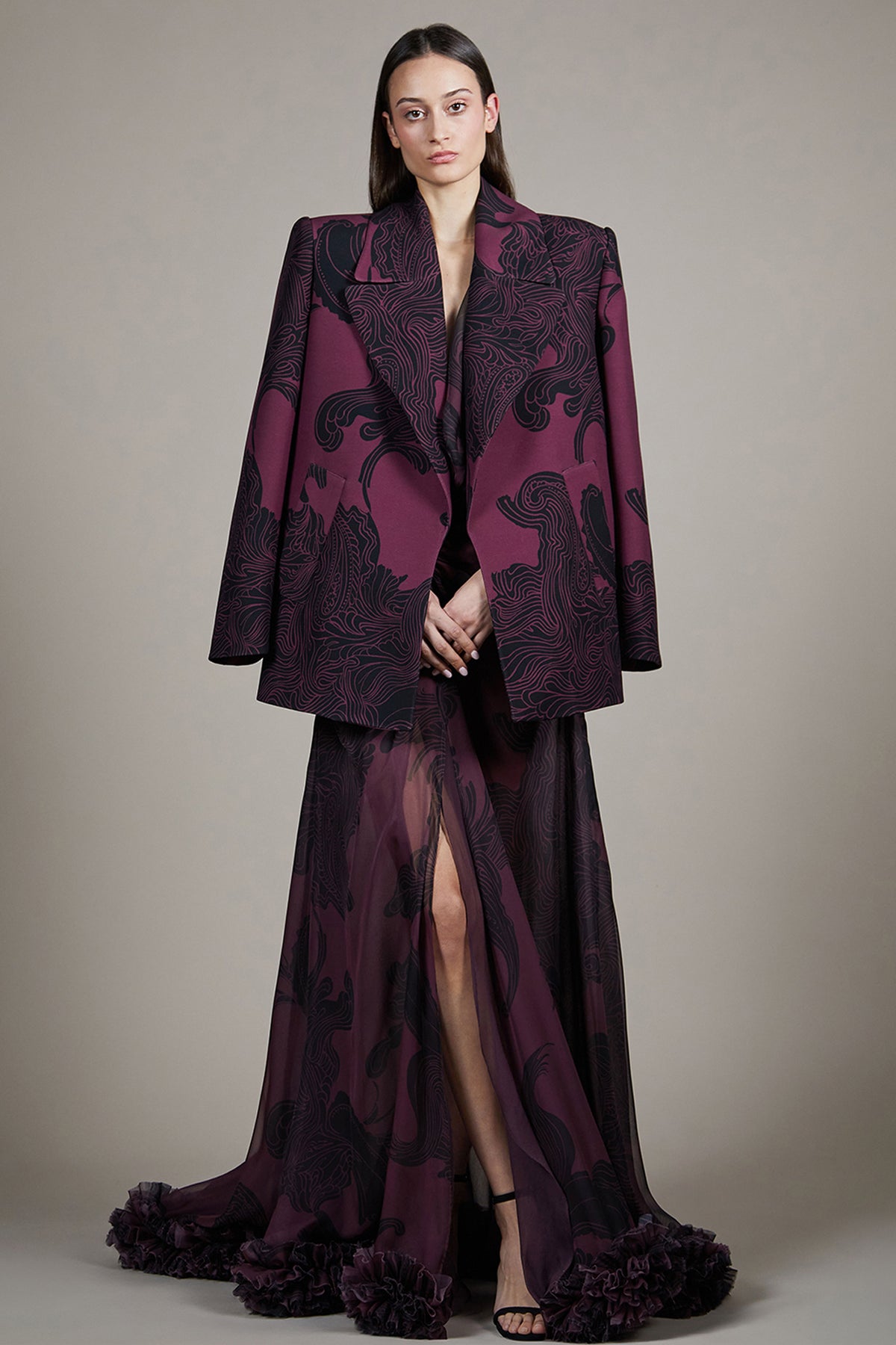 Deep plum long dress. Featuring an oversized blazer jacket with exaggerated sharp shoulders and wide peak lapels. Complemented with a daring thigh-high slit on the left side.