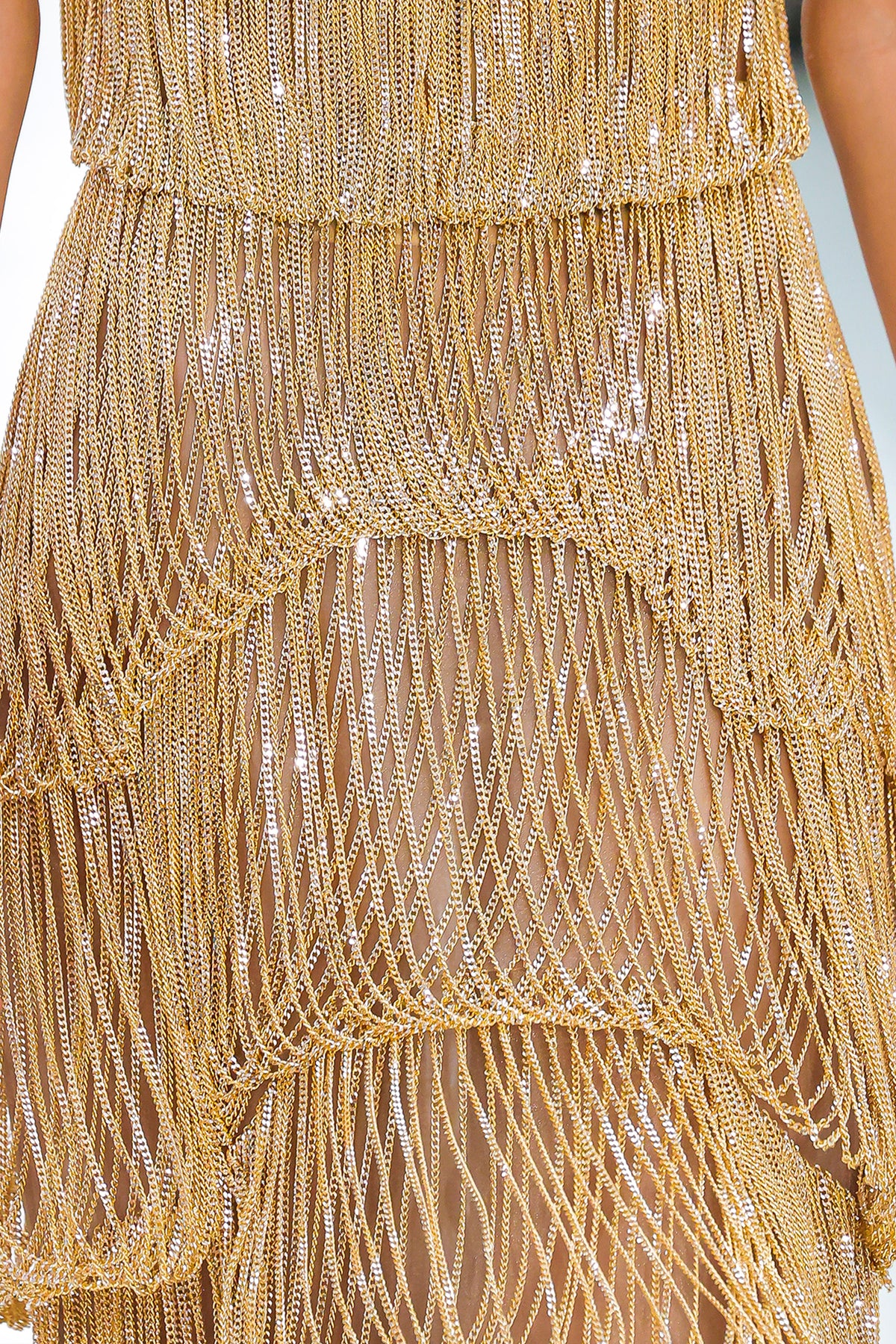 Champagne long column dress. Featuring a multi-tiered fringe detailing with delicate spaghetti straps. Complemented with a soft V-neckline beaded paneling that mimics a corset or bustier.