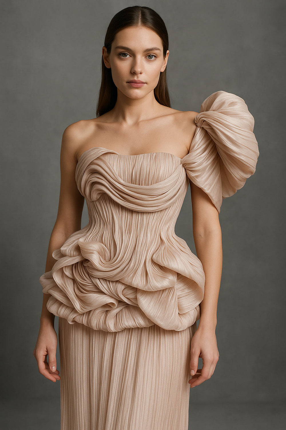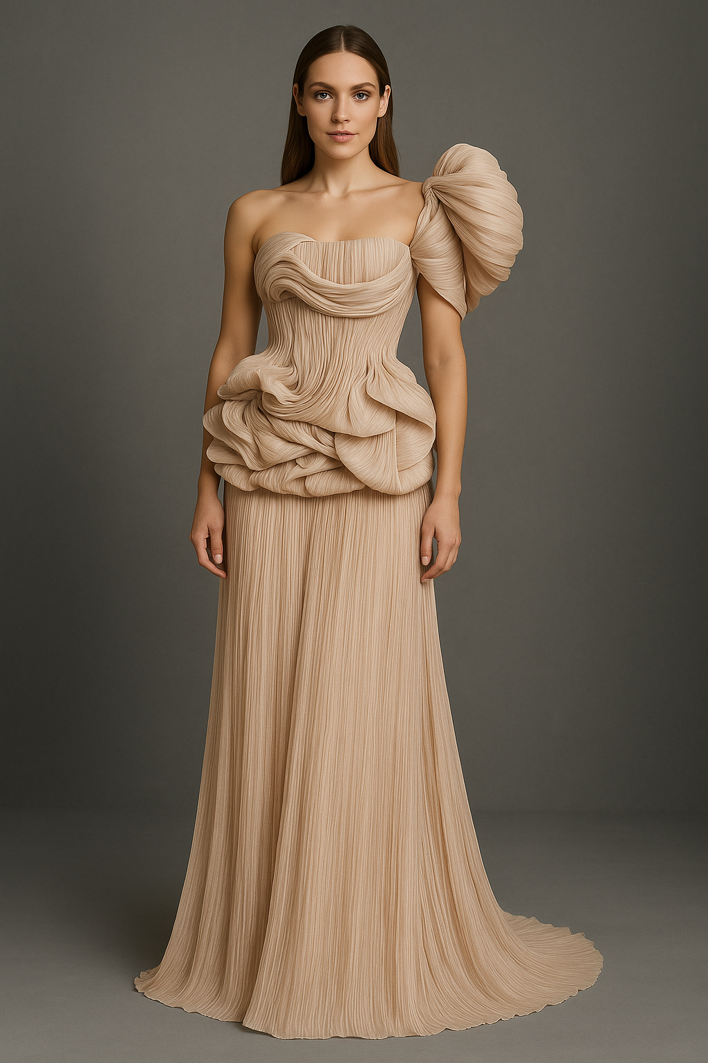 A-Line Long Dress with Strapless Ruffled Bodice