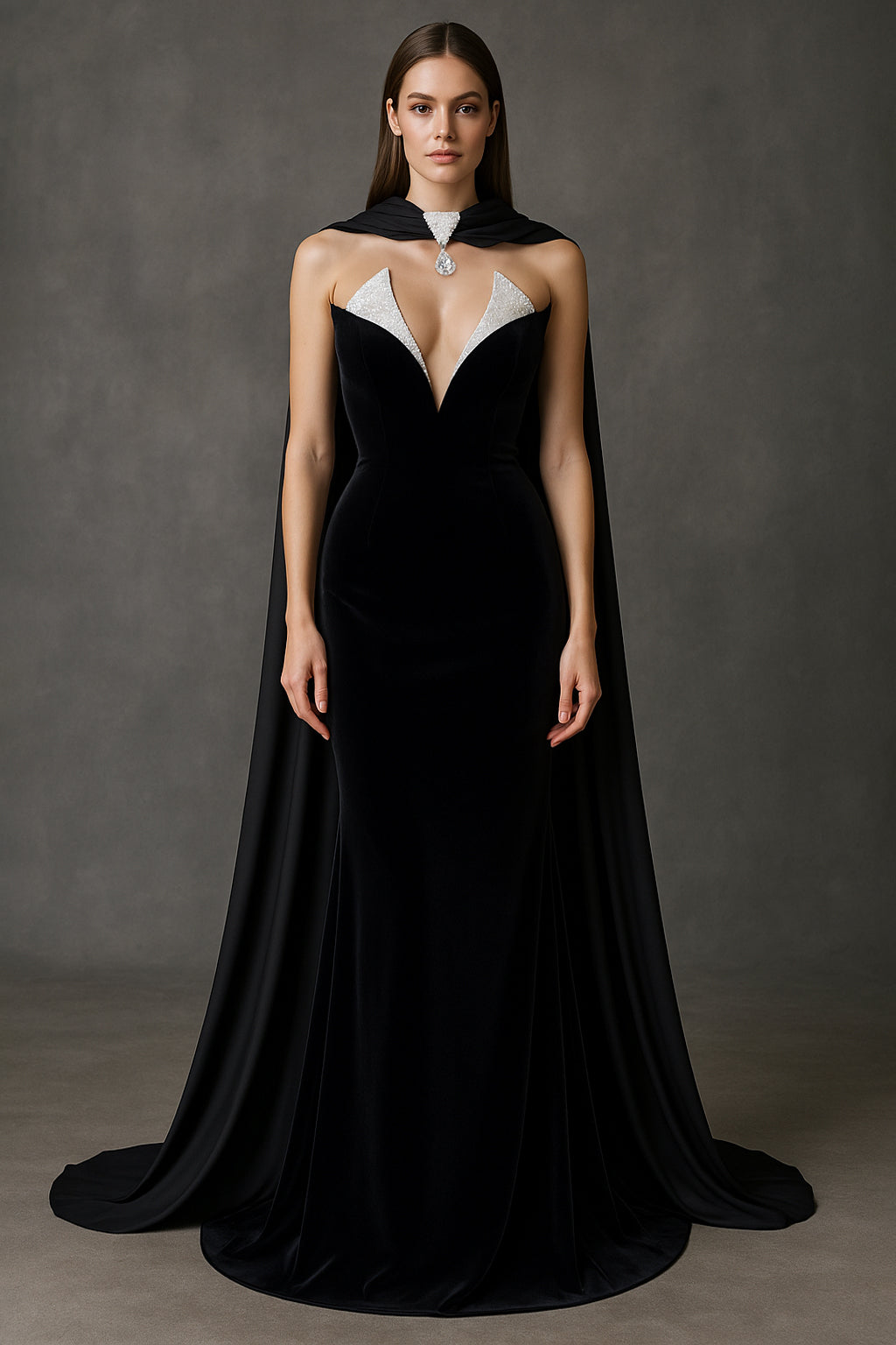 Full-Length Dress with Embellished Cape