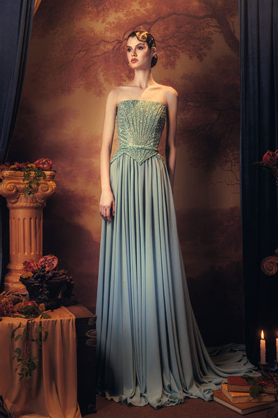 Blue strapless pleated dress. Featuring a straight neckline, and a beaded corset with a thin belt waist. Complemented with a pleated A-line silk skirt, and a sweep train.