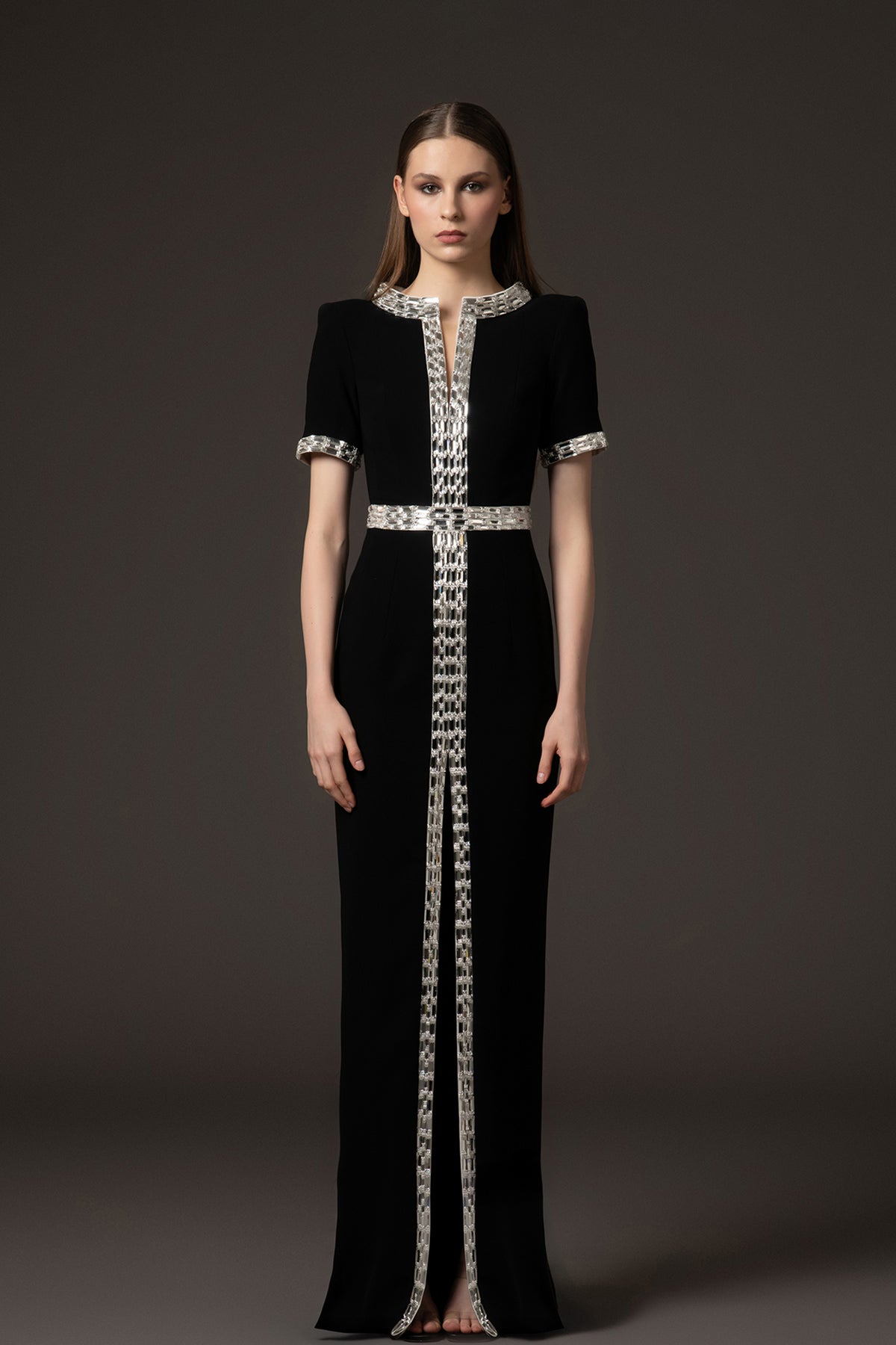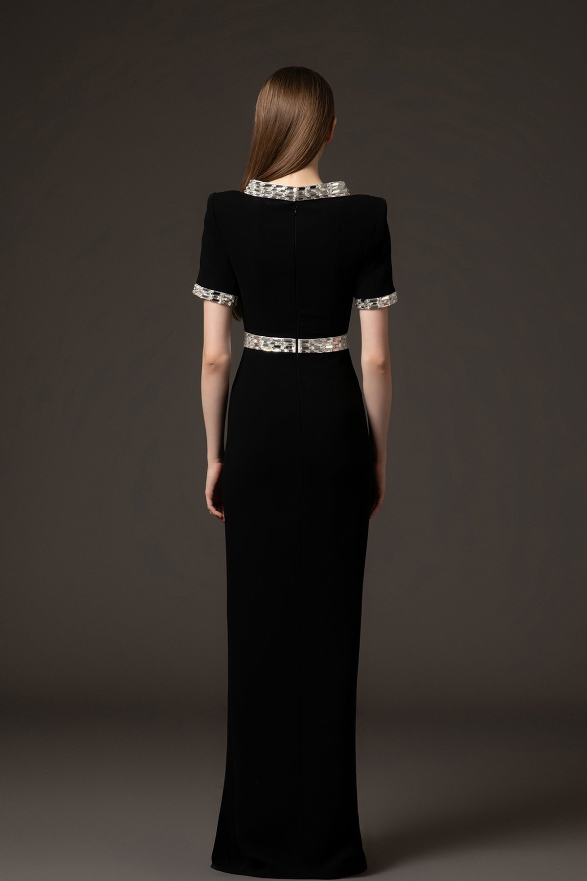 Black crêpe column long dress. Featuring a baguette embroidery with short sleeves and center back zipper and front slit.
