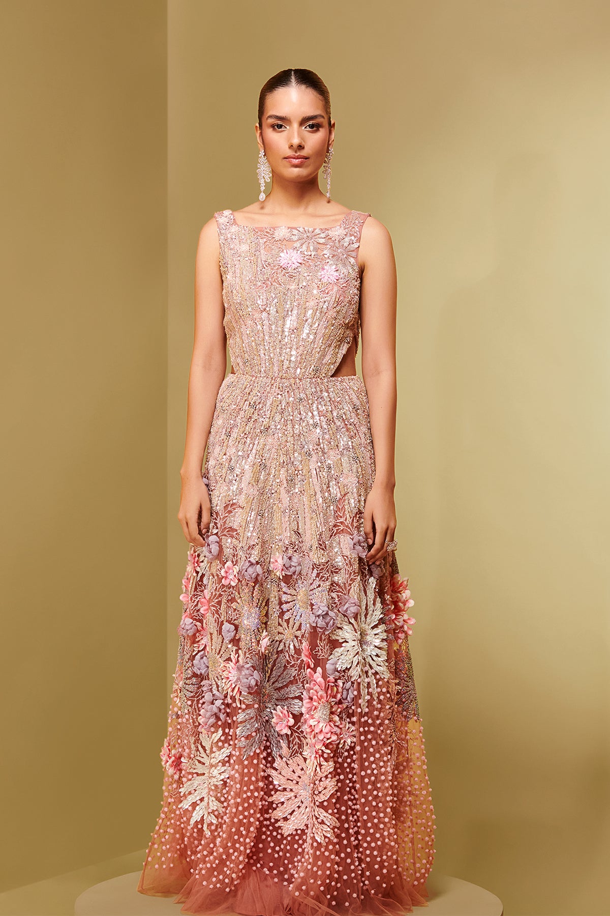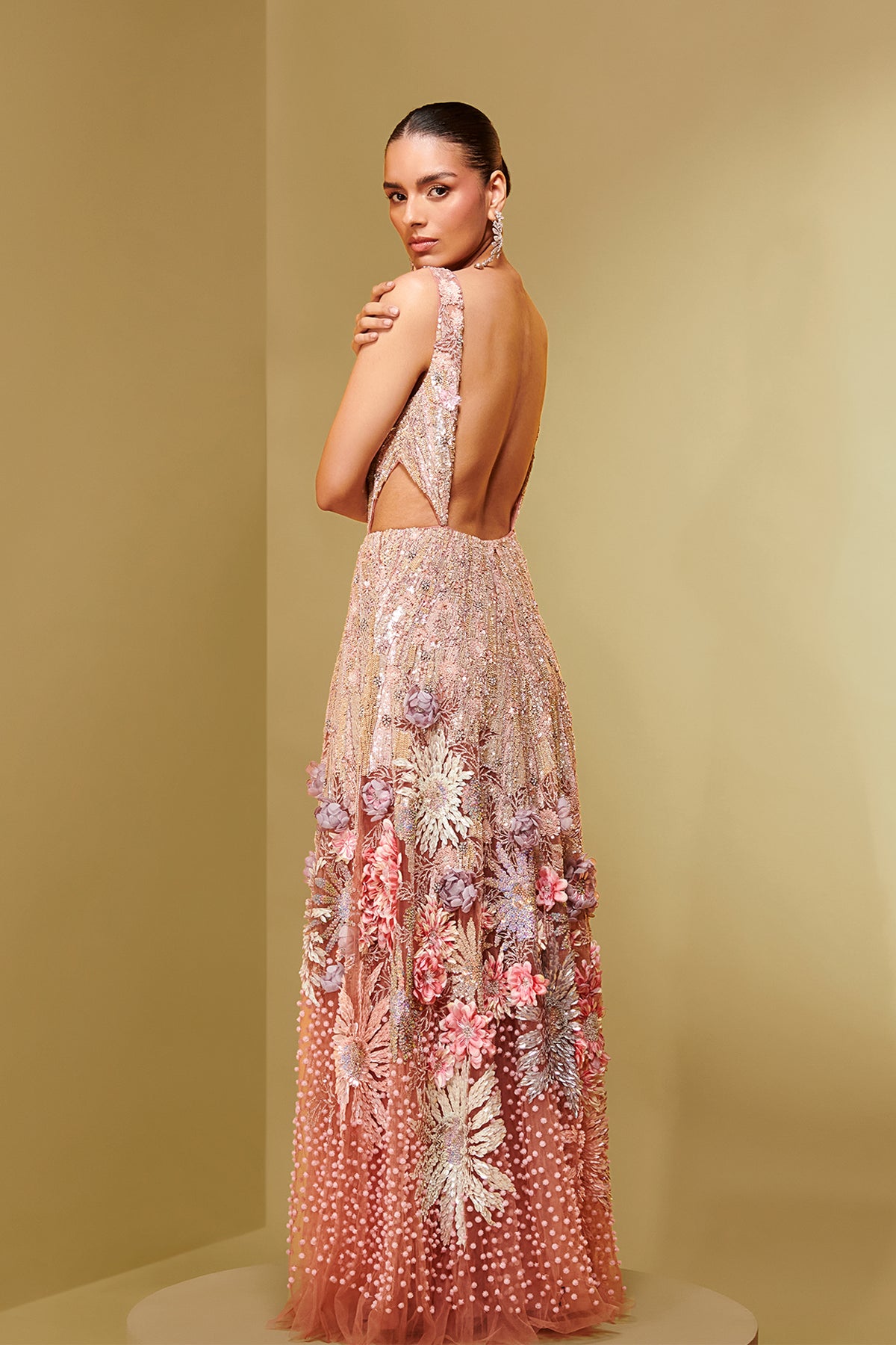 Coral mesh and crepe dress. Featuring exquisite embroidery that cascades down the bodice and skirt, creating a stunning tapestry of intricate patterns and luxurious textures. Complemented with a pièce de résistance is the feathered hemline.