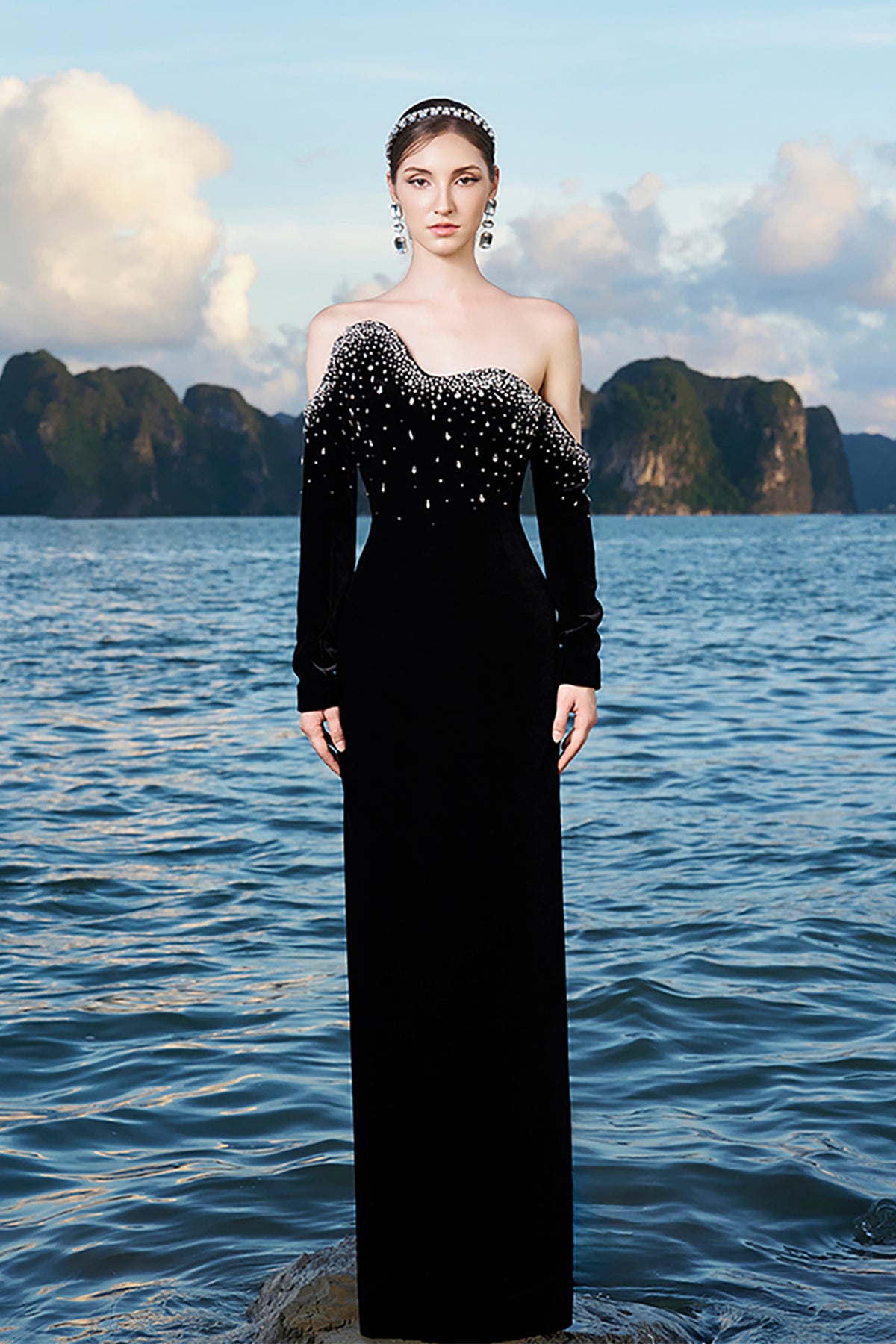 Black velvet dress. Featuring a wavy off-the-shoulder with long sleeves and a straight skirt form. Complemented with a stylized crystal-embellished and a back slit, hidden tear-drop zipper at the back.