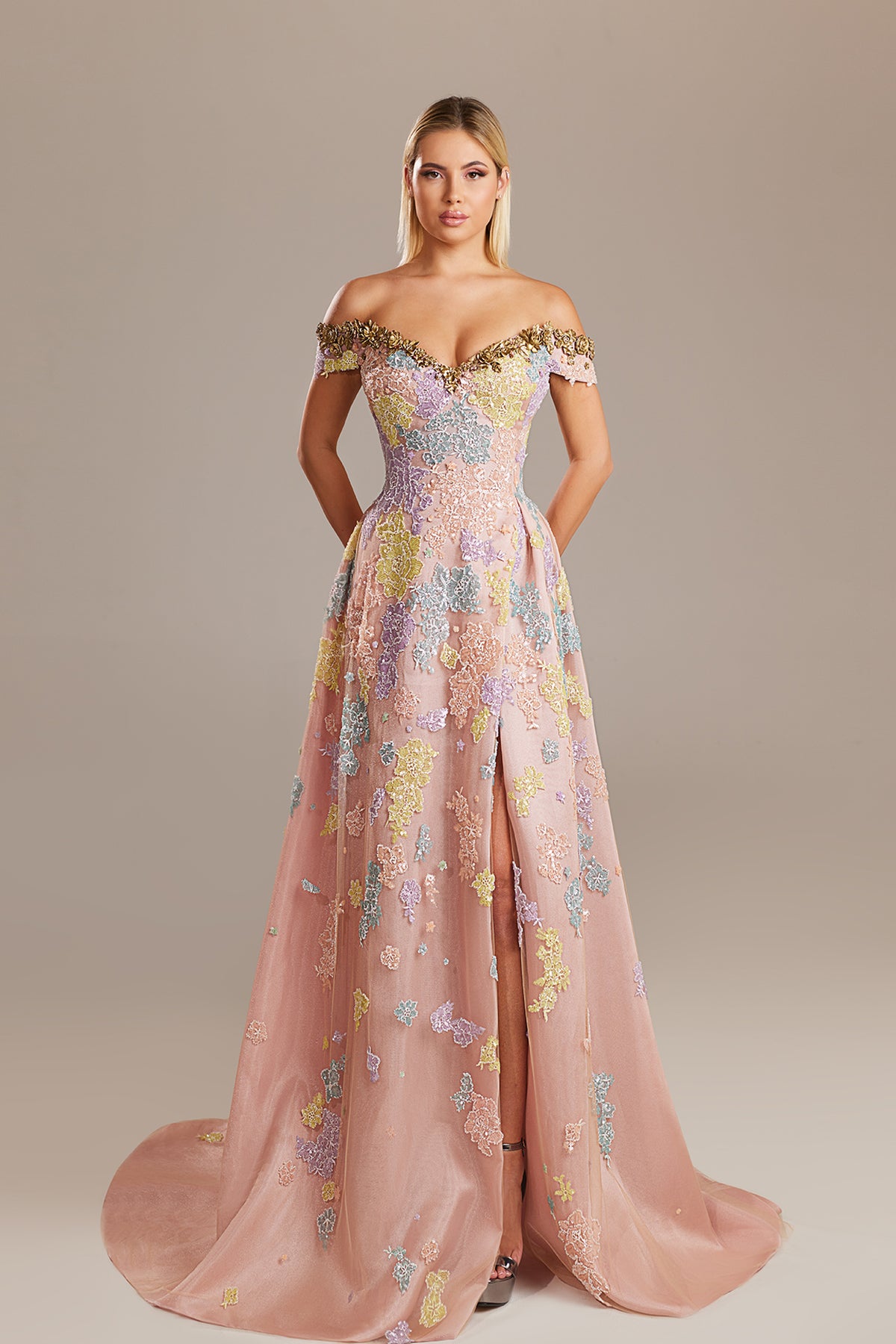 Blush long a-line dress. Featuring an off-the-shoulder neckline with fitted bodice adorned with delicate scalloped edging and short. Complemented with bodice is densely embellished with floral embroidery that radiates from the neckline and centers toward the waist.