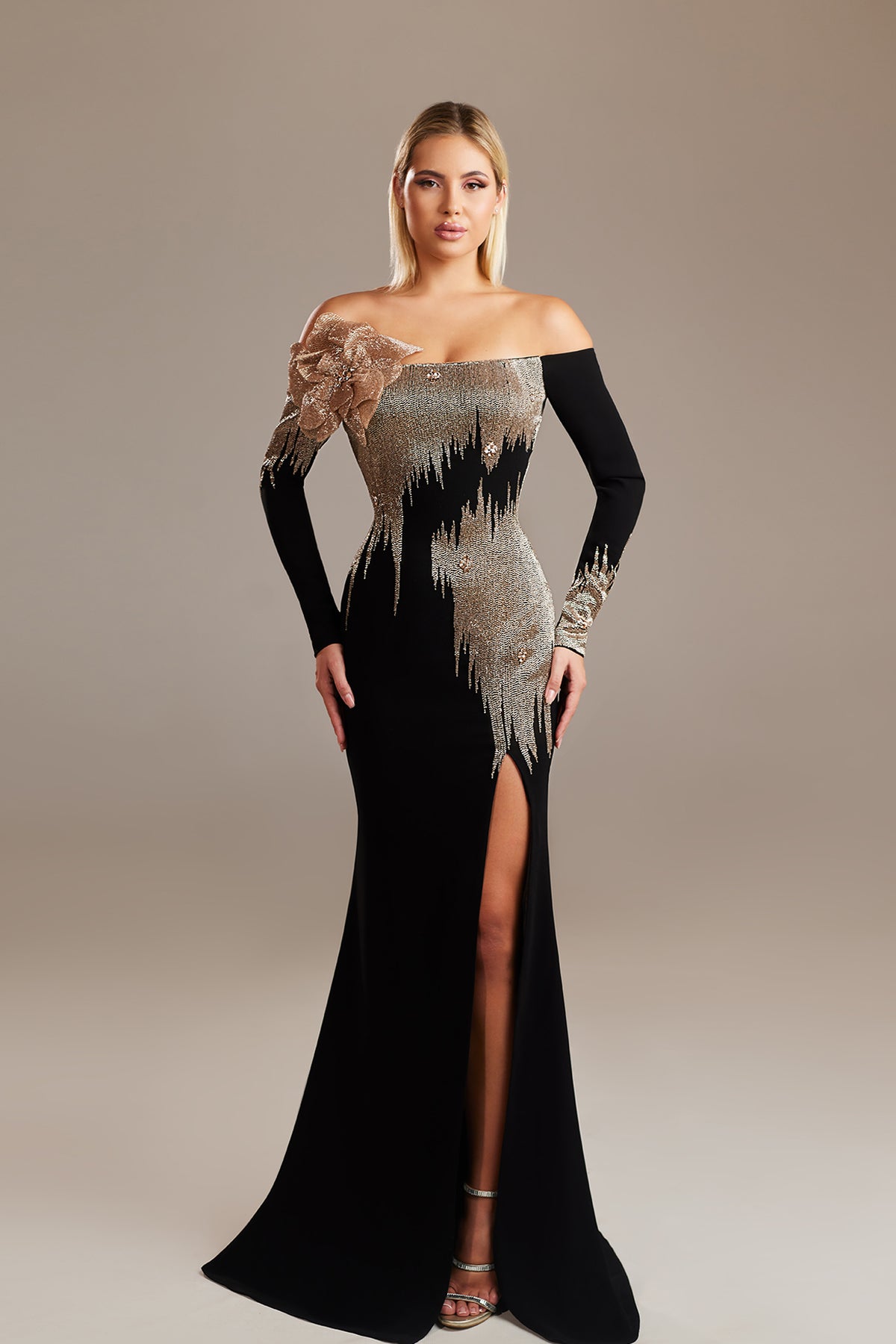 Gold and black mermaid long dress. Featuring a fitted slip-drape that hugs the body through the bodice and hips before flaring subtly toward the hem. Complemented with an off-the-shoulder neckline, a bold gradient of shimmering beads and sequins forms a jagged, zigzag pattern across the bodice and upper skirt. Completed with a high front thigh slit on one side.