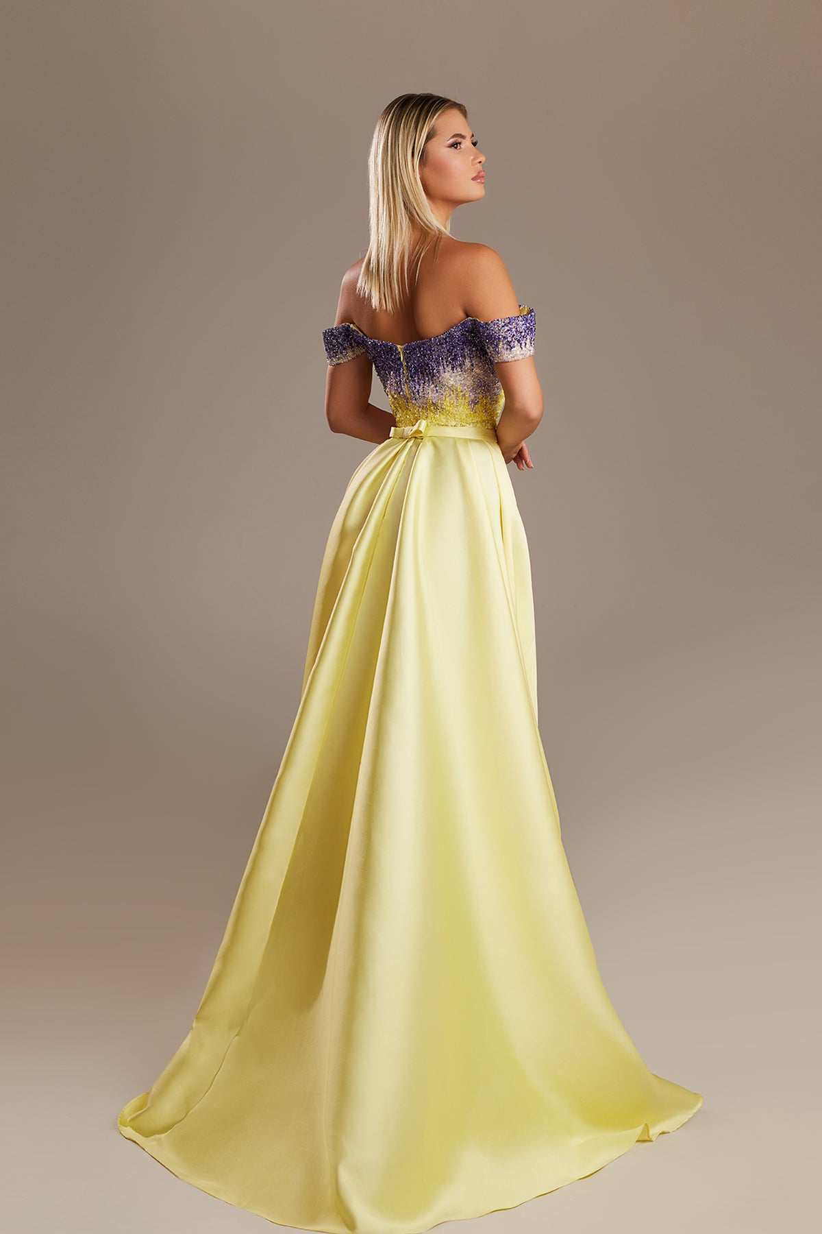 Pale yellow a-line long dress. Featuring a high-contrast front slit runs up the center front ending just above mid-thigh. Complemented with voluminous skirt and a fitted bodice that hugs the waist before flaring into the full skirt and an off-the-shoulder neckline that gracefully drapes over the collarbones.
