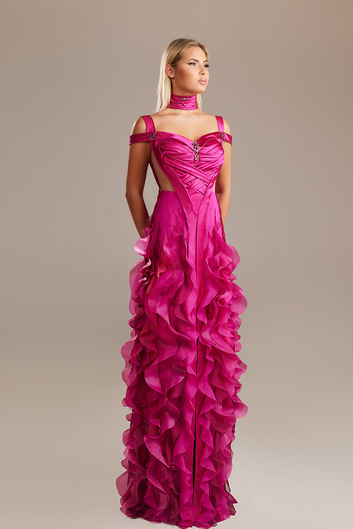 Magenta floor-length dress. Featuring a ruffled skirt that adds a vertical interest giving the appearance of extra length and movement. Complemented with an ruffled skirt sweetheart-inspired sweetheart neckline with off-the-shoulder straps or delicate cutouts.