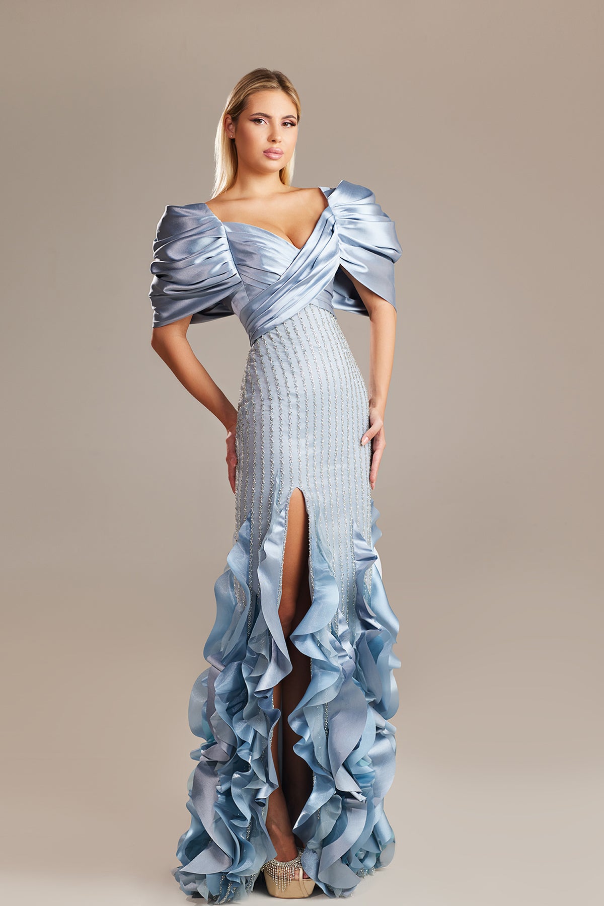 Light blue full-length dress. Featuring a short sleeves with a fitted column silhouette that hugs the torso and hips and an off-the-shoulder neckline that sits wide across the collarbones. Complemented with multi-layer wrap that crosses at the bust embroidery accents may appear at the waist cascading ruffles.