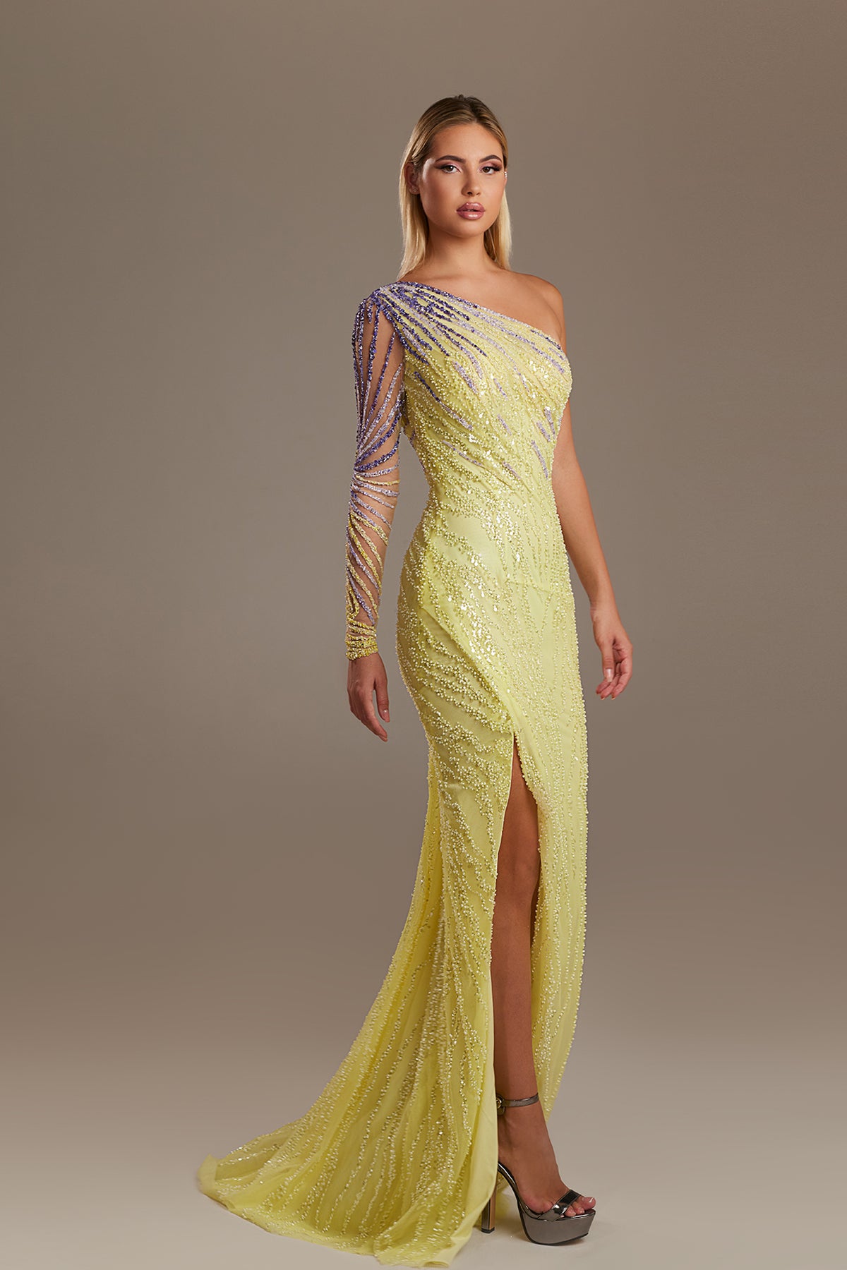 Pale yellow column long dress. Featuring a form-fitting with one-shoulder dress that hugs the body from the bust to the hips. Complemented with densely beaded or sequinned providing a textural contrast to the smooth skirt and the embellishment pattern sweeps from the neckline the torso.