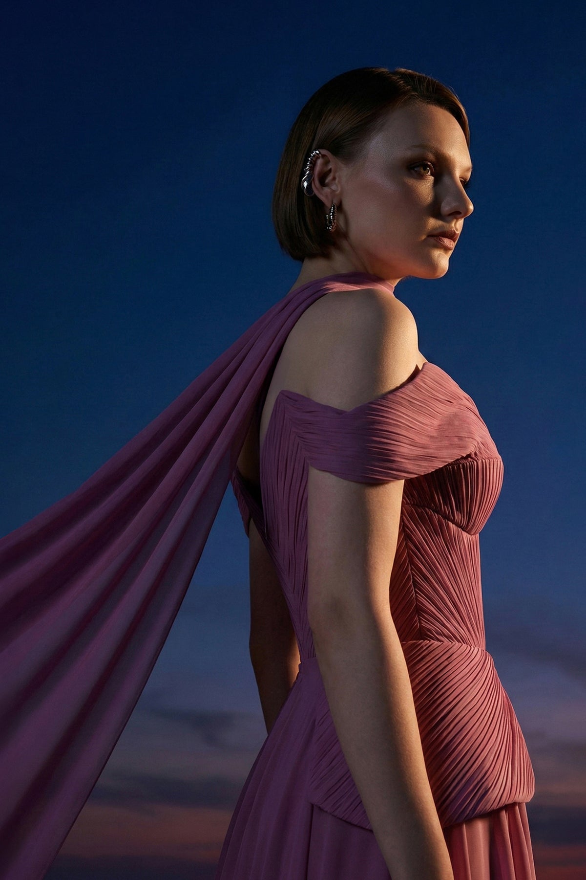 Purple long off-the-shoulder dress. Featuring a blend of sculptural draping with a sweeping ethereal flow. Complemented with a sweetheart-inspired silhouette a defined waist is created by draping and gathered fabric that wraps around forming a subtle belt-like visual without a bulky buckle.