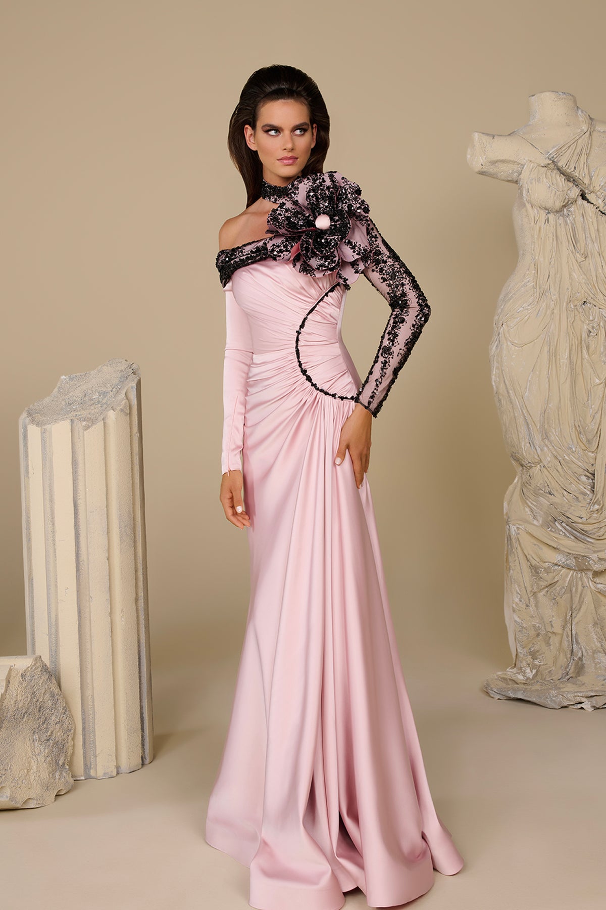 Light pink long dress. Featuring a fitted mermaid neckline shape that hugs the figure with an embroidery beading along the neckline and ruching. Complemented with embroidery or beading along the neckline and ruching.