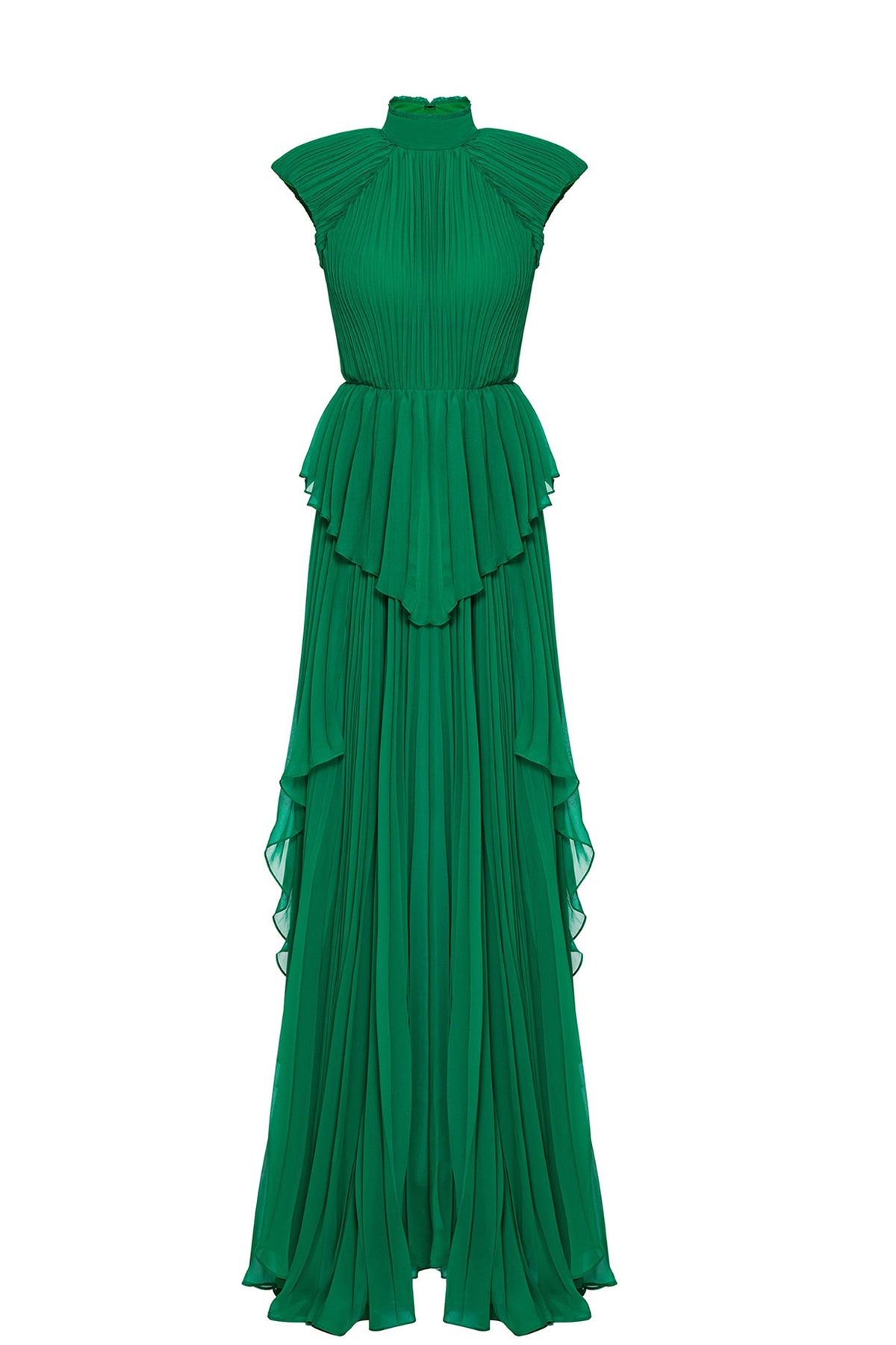 Blue long dress. Featuring a high-neckline cut plissé rhythm with a flared lower cut. Complemented with a belt and a multi-level hem.