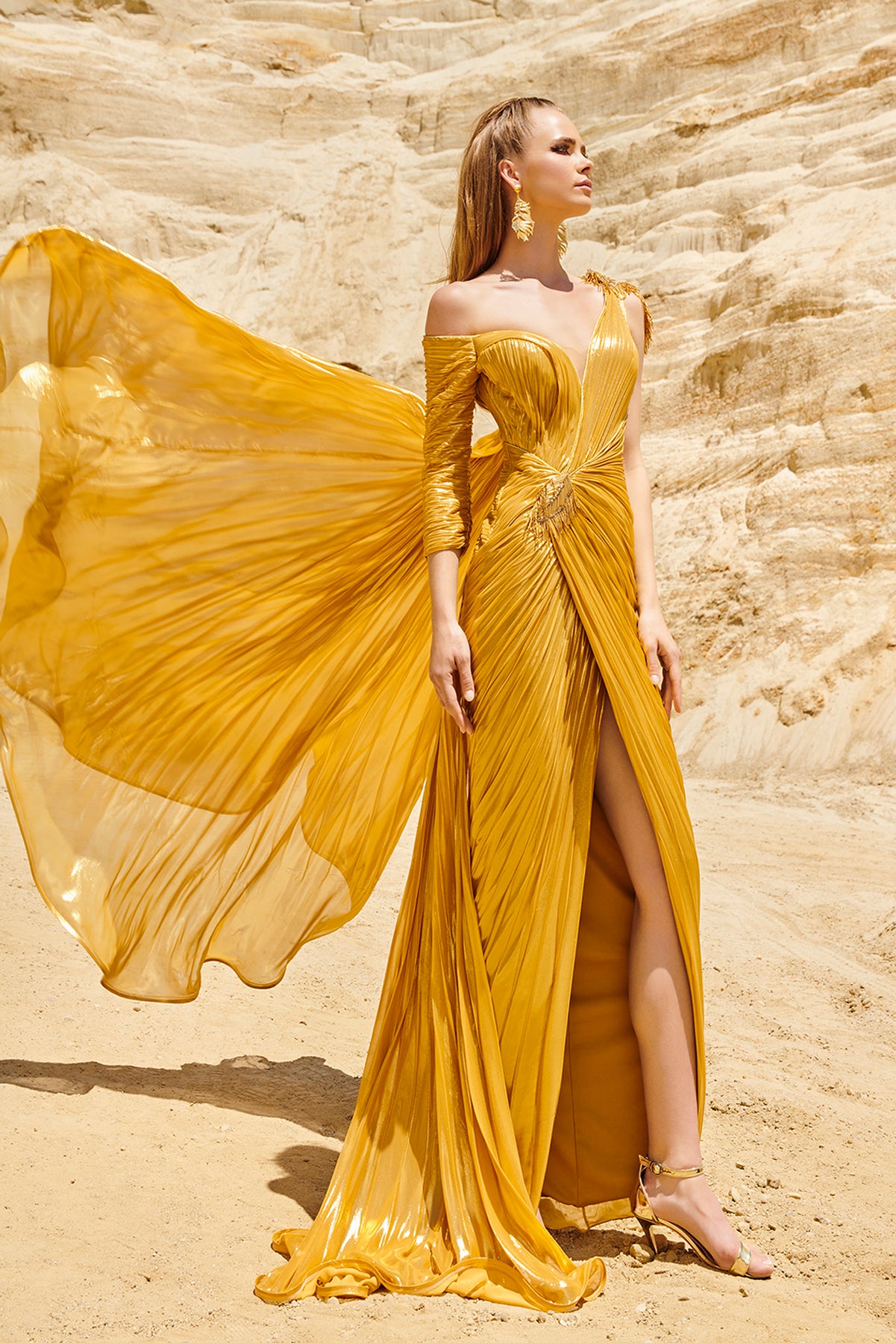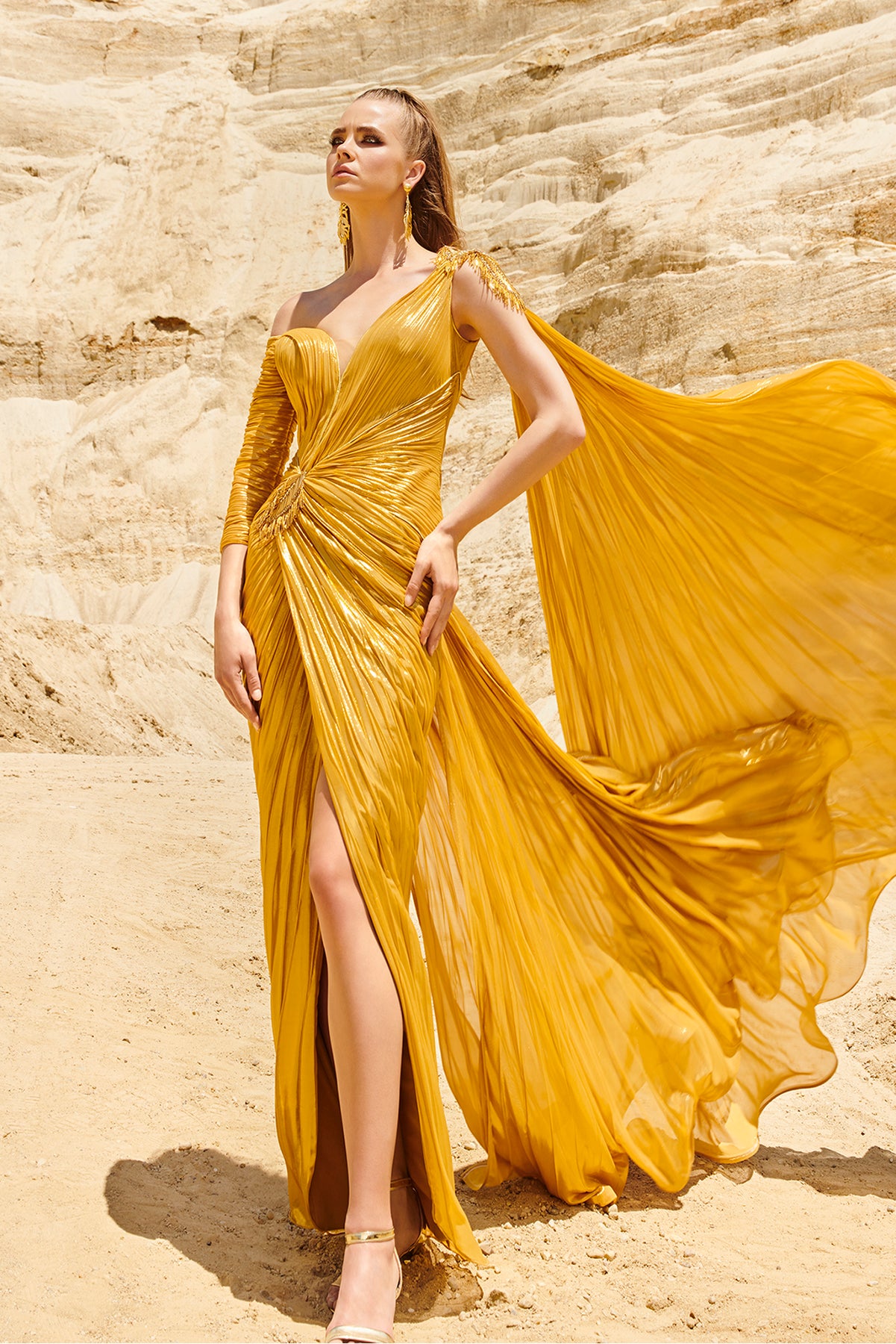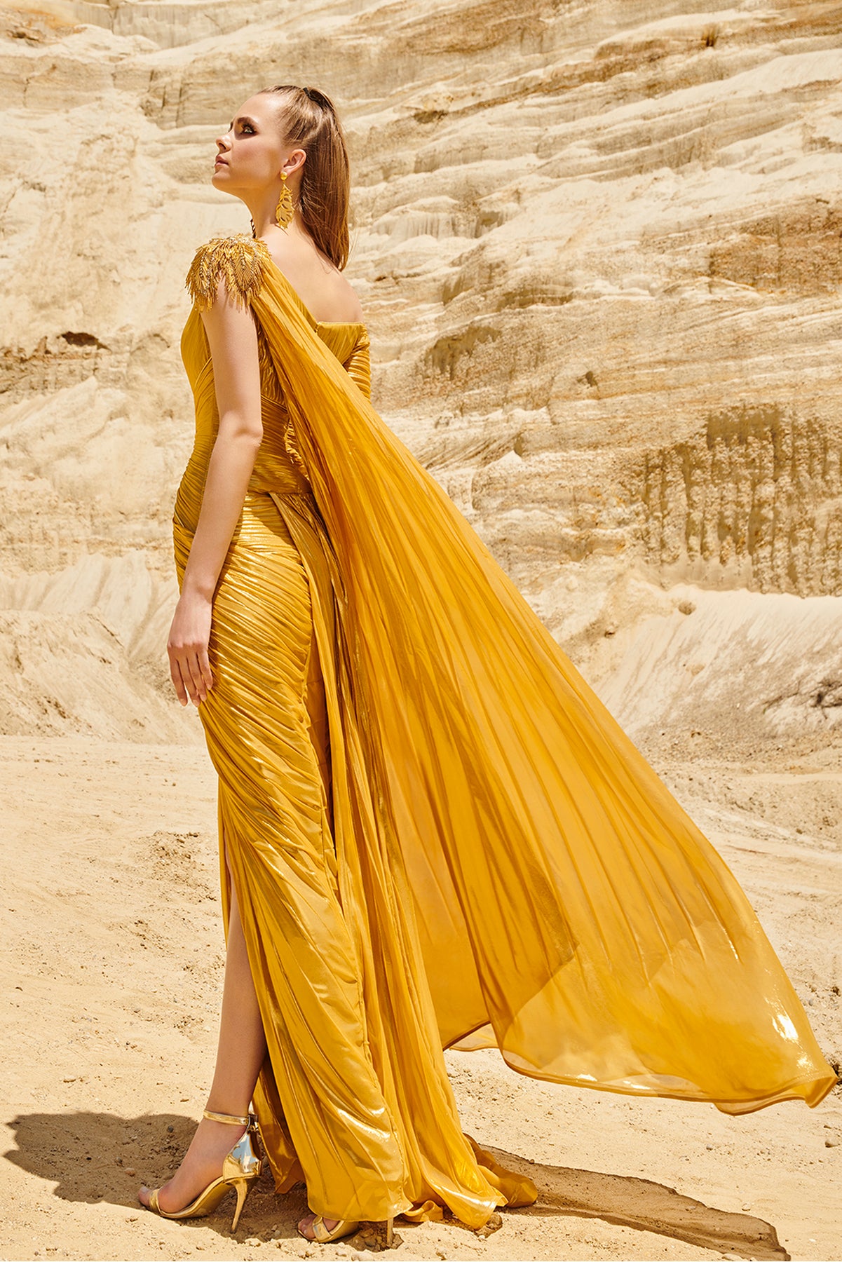 Gold satin long dress. Featuring a fitted bodice designed to sculpt the torso, with a secure construction that defines the waist and creates a crisp waist seam.