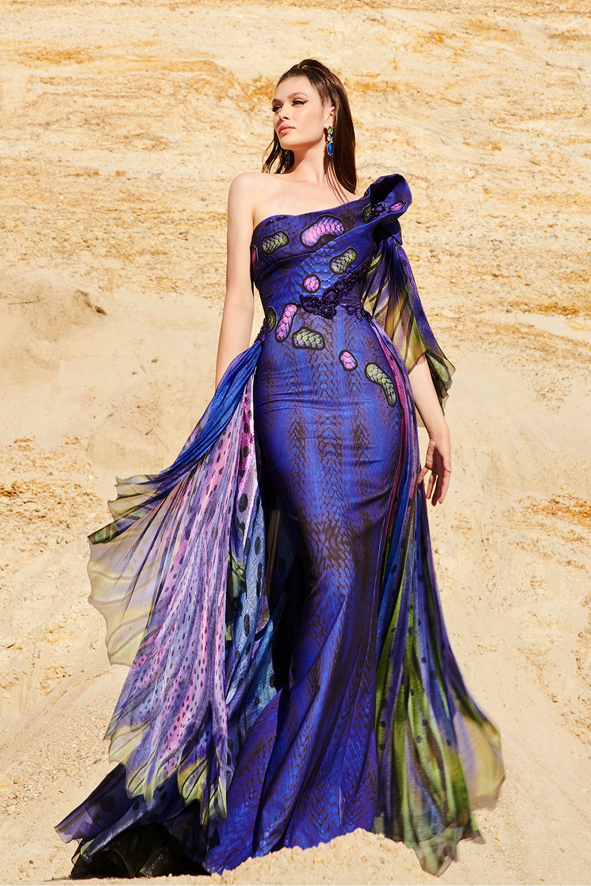Multicolor A-line satin mermaid long dress. Featuring an one-shoulder neckline with a voluminous panelled skirt.