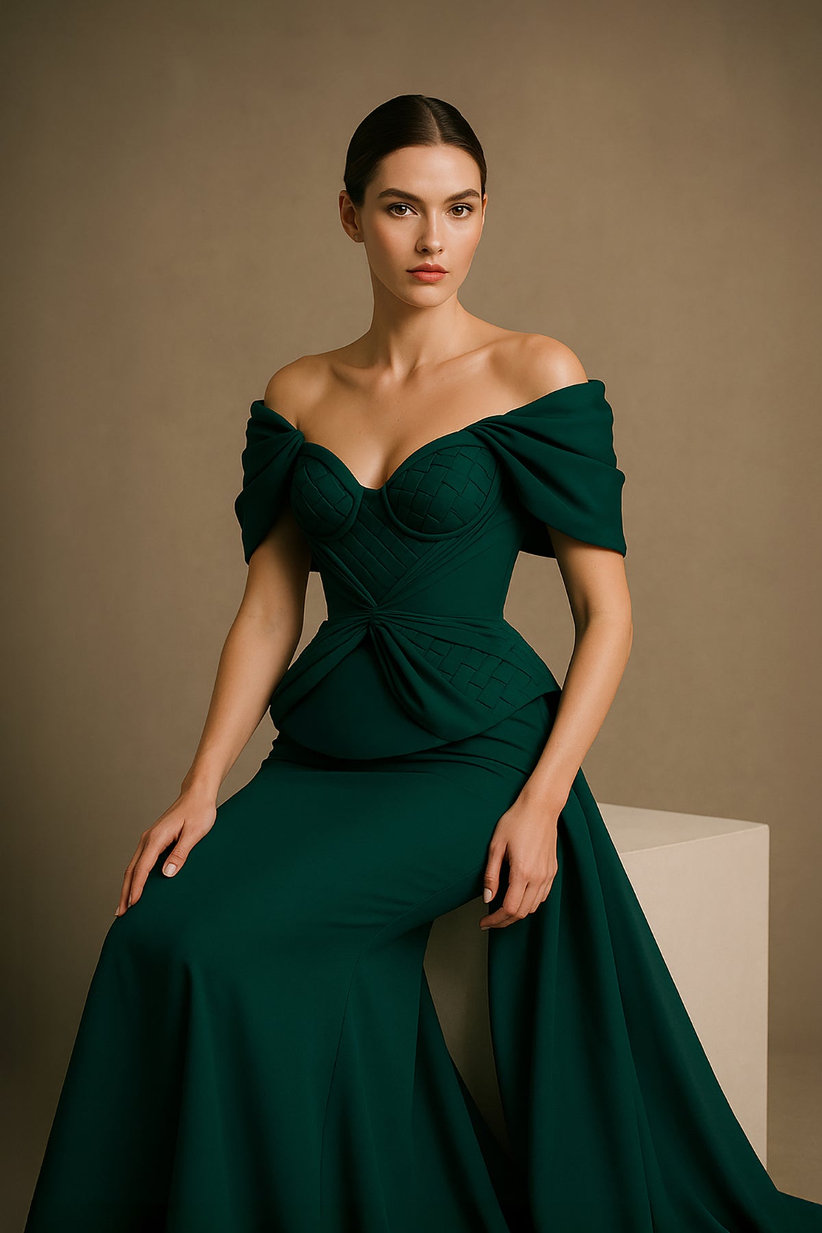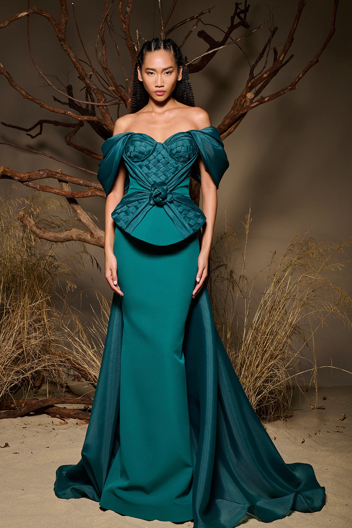 Teal crepe and organza long dress. Featuring a corseted bodice with woven detailing off-the-shoulder neckline draped sleeves frame the neckline with a waist blooms into a structured peplum knot design. Complemented with a long organza train spills from the back.