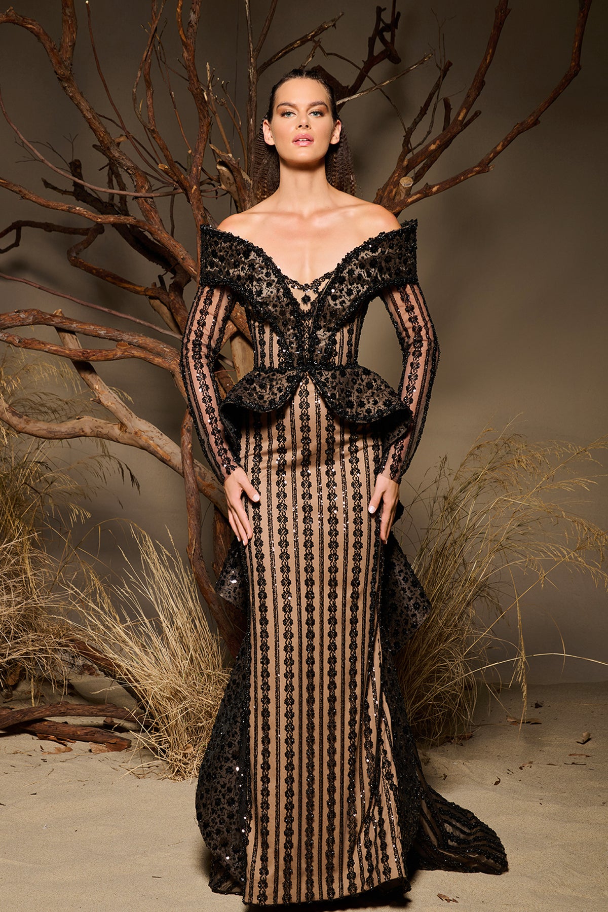 Multi embroidered tulle with sequin embellishment long dress. Featuring an off-the-shoulder neckline V-shape with sheer long sleeves and lace embroidery. Complemented with a waist structured peplum accentuating the silhouette and cascading tiered back layers with floor-length train.