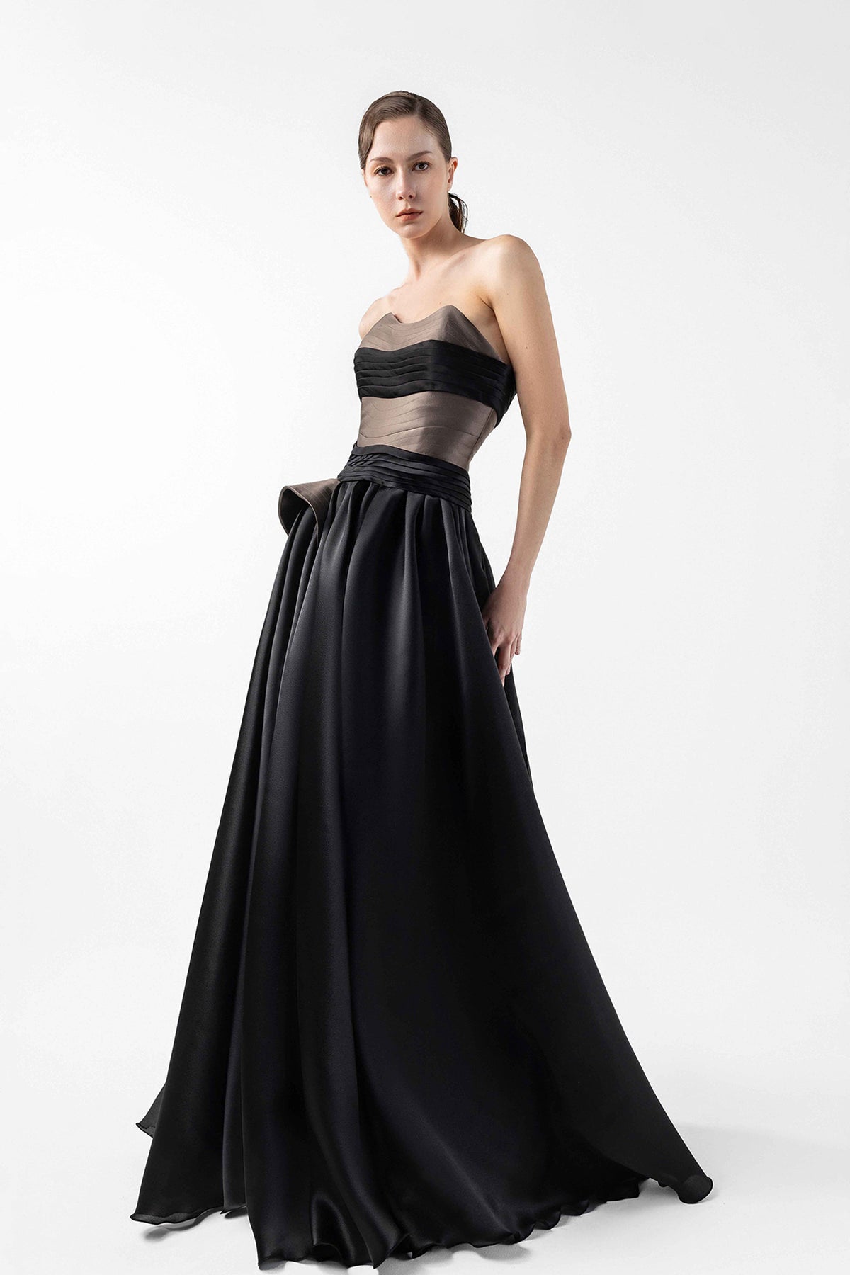 Black and silver A-line dress. Featuring a organza for a subtle sheen with a strapless bodice is sculpted from chocolate Mikado with alluring curvy seams that define and flatter the figure. Complemented with a chic and distinctive bodice the dress cascades into a voluminous full skirt with a hip enhancing detailing.