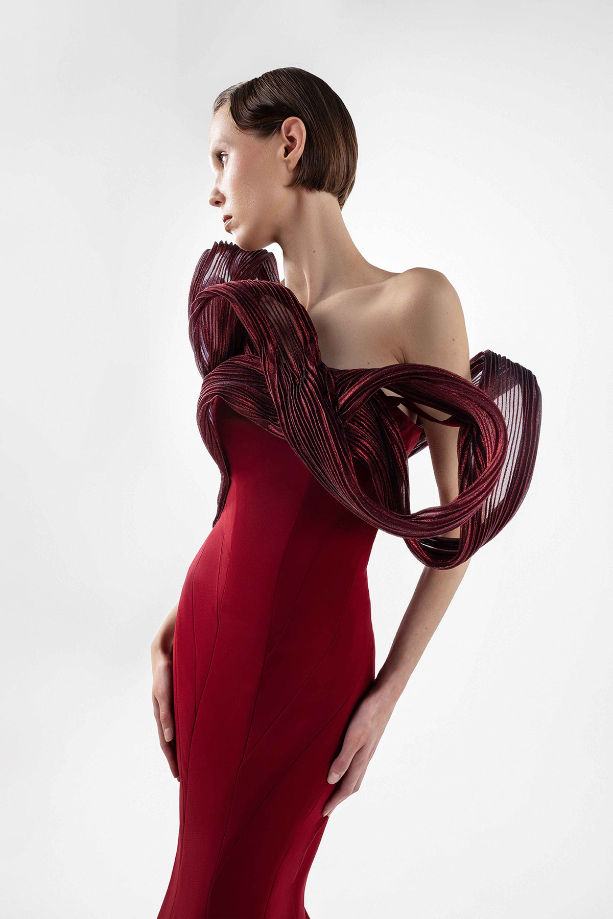 Burgundy crepe dress. Featuring a sculpts with precision tailoring and a sweeping mermaid silhouette. Complemented with a neckline and shoulders are crowned with voluminous hand-shaped loops of ribbed lamé organza with an architectural flourish. Completed with an interplay between structured form and fluid detailing that creates a commanding high-fashion presence.