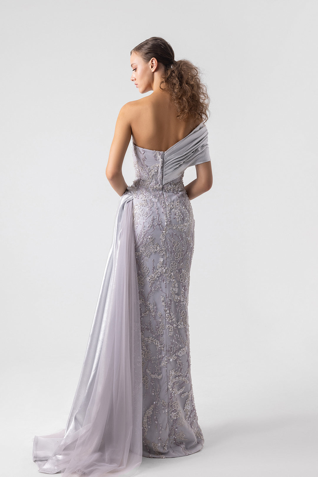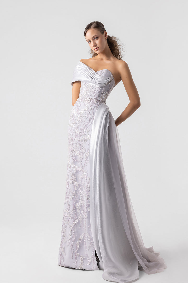 Silver one-shoulder sleeves dress. Featuring embellished lace with a wave-draped lamé organza. Complemented with high silt adorned beautifully with a draped organza and tulle train.