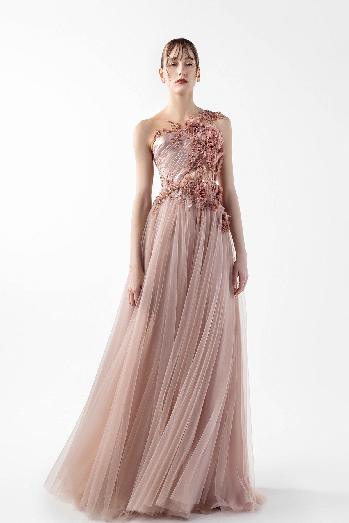 Light pink tulle dress. Featuring an illusion neckline and a sheer back adorned with back button details with a handcrafted 3D floral embroidery with shimmering sequins cascades from the bodice that creates a sculptural yet delicate effect. Complemented with a soft flowing tulle skirt that adds a volume and graceful movement.