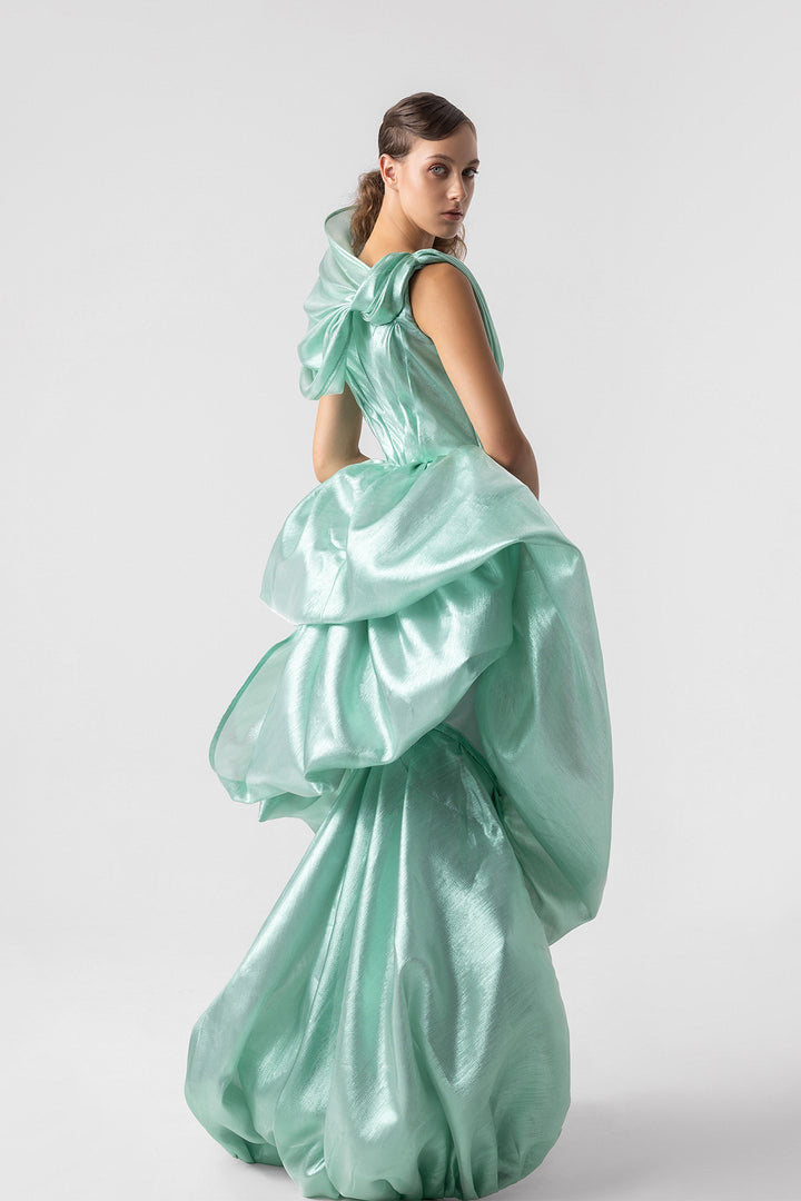 Aqua lamé organza draperies dress. Featuring a high slit, intricate draperies swirl around the gown. Complemented with capturing the essence of movement and the fluidity of water.