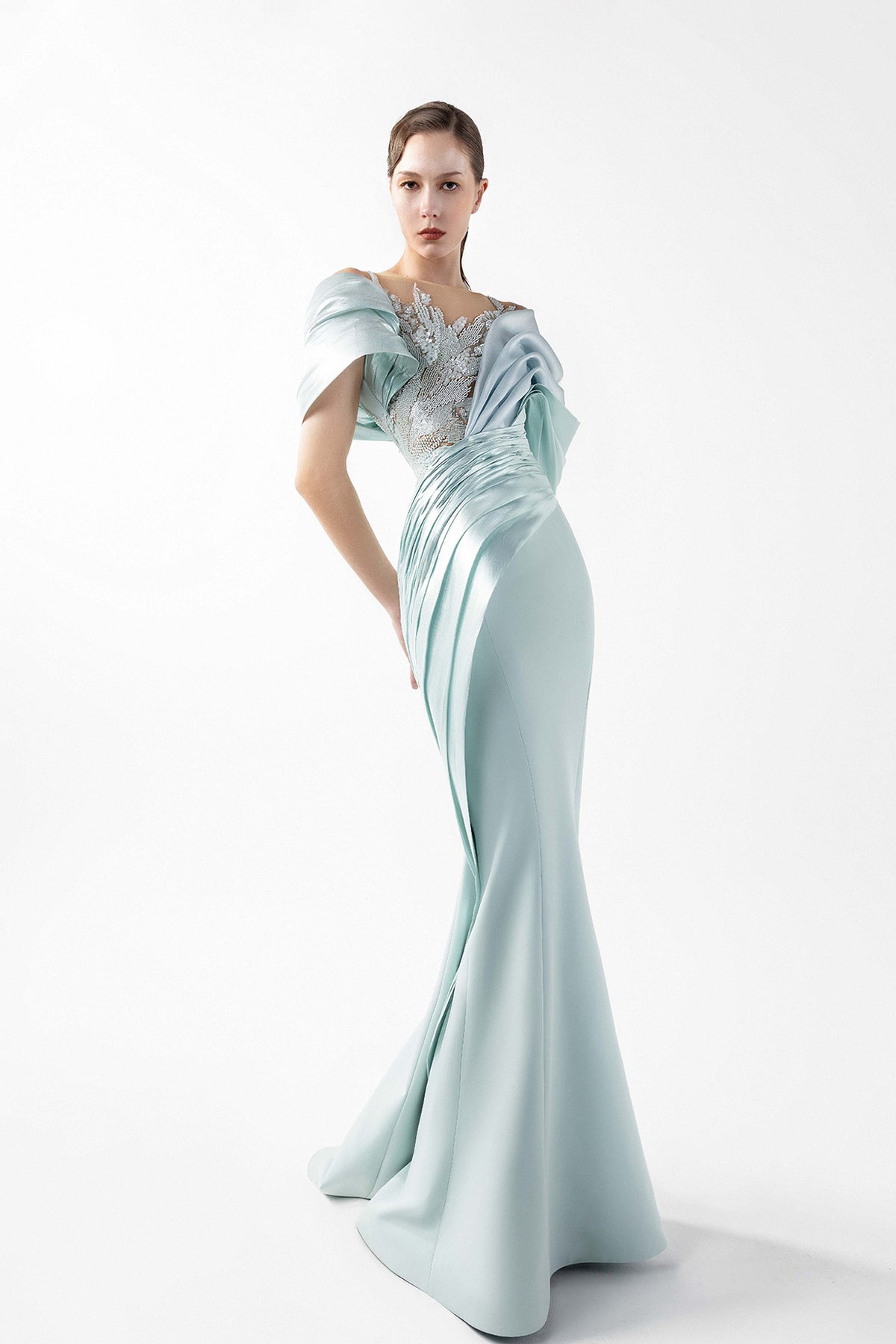 Mint blue crepe dress. Featuring a sculpted base with a fluid mermaid silhouette and bodice is delicately composed of illusion tulle and embroidered lace that creates a sheer into the back. Complemented with a shimmering metallic fabric forms off-the-shoulder neckline panels and hip draping that adds a sculptural edge. Completed with a finishing details include a line of delicate buttons along the back.
