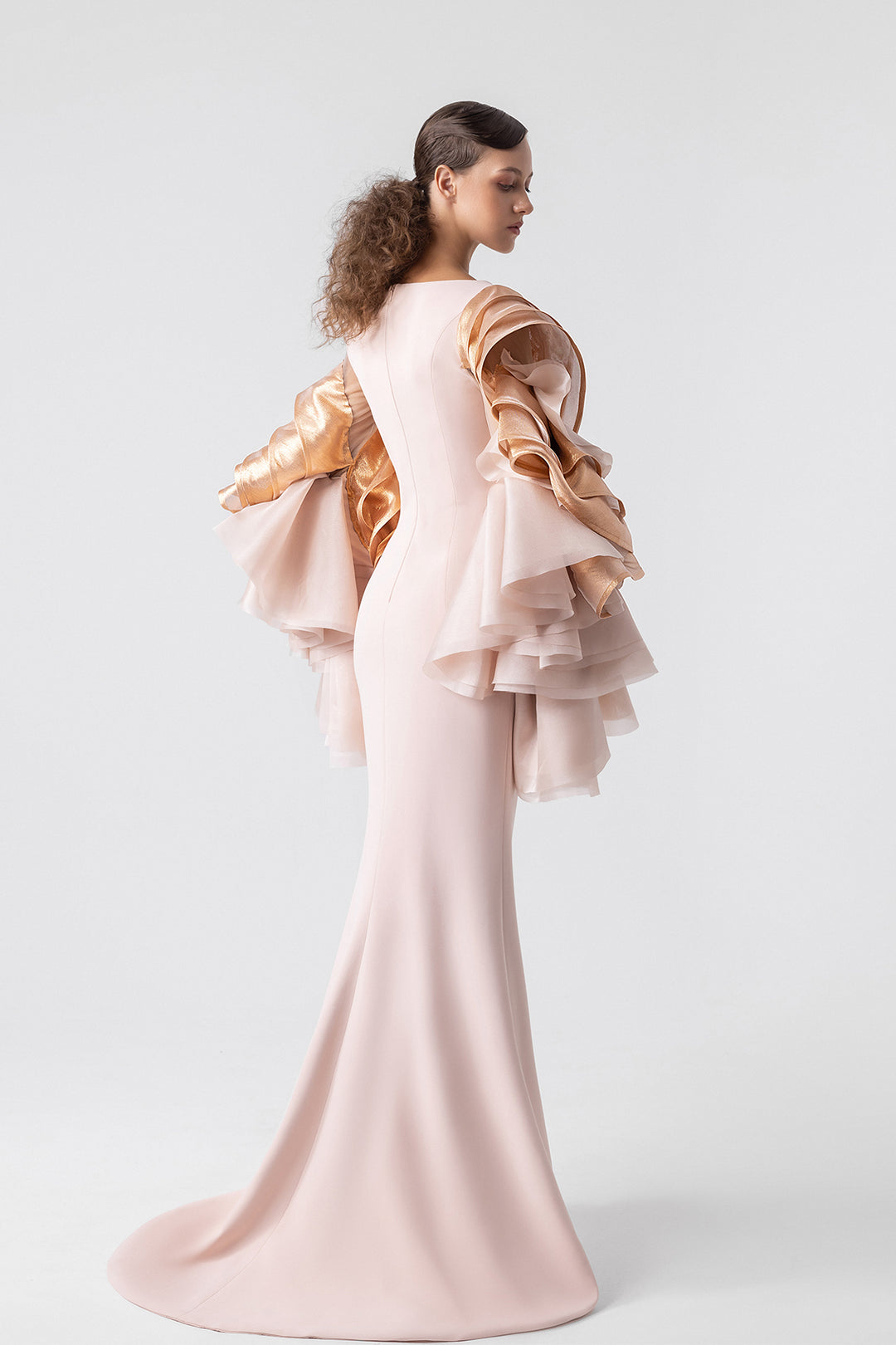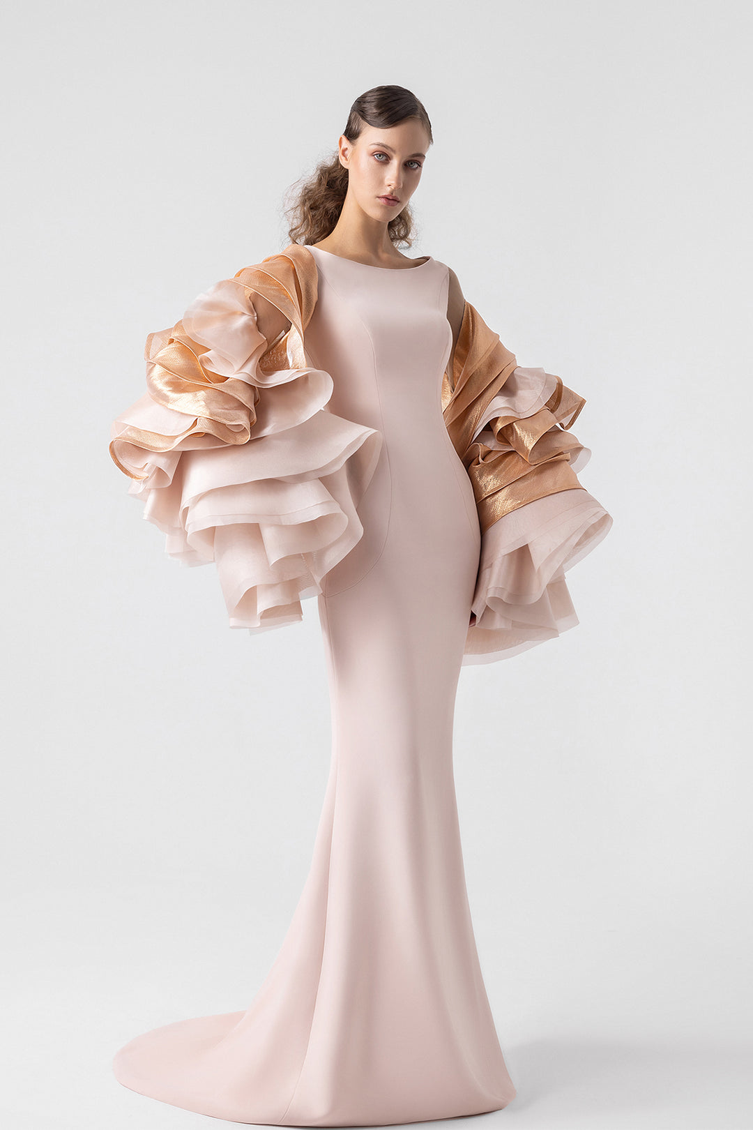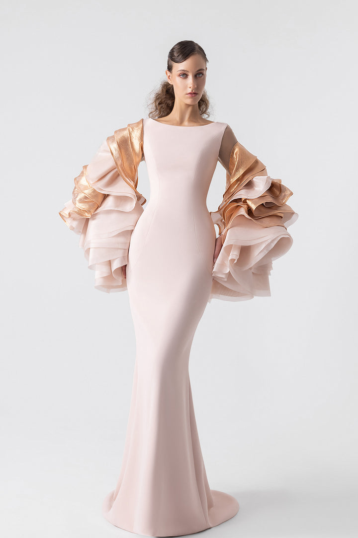 Salmon pink crepe mermaid dress. Featuring dazzling metallic organza ruffled sleeves and shimmering metallic lamé accents.